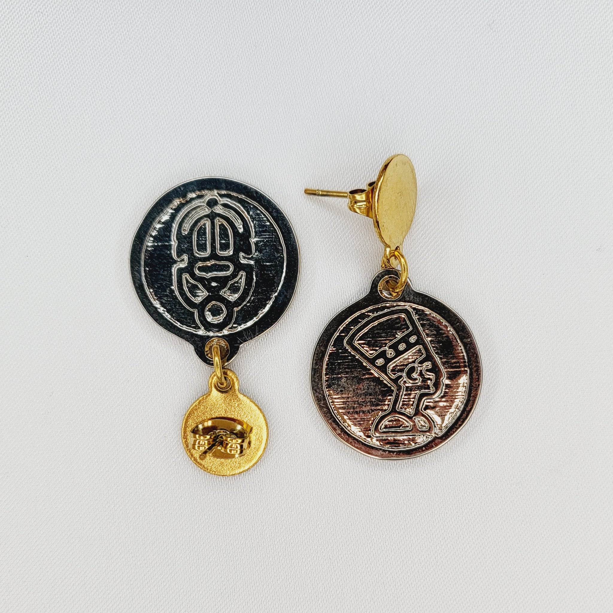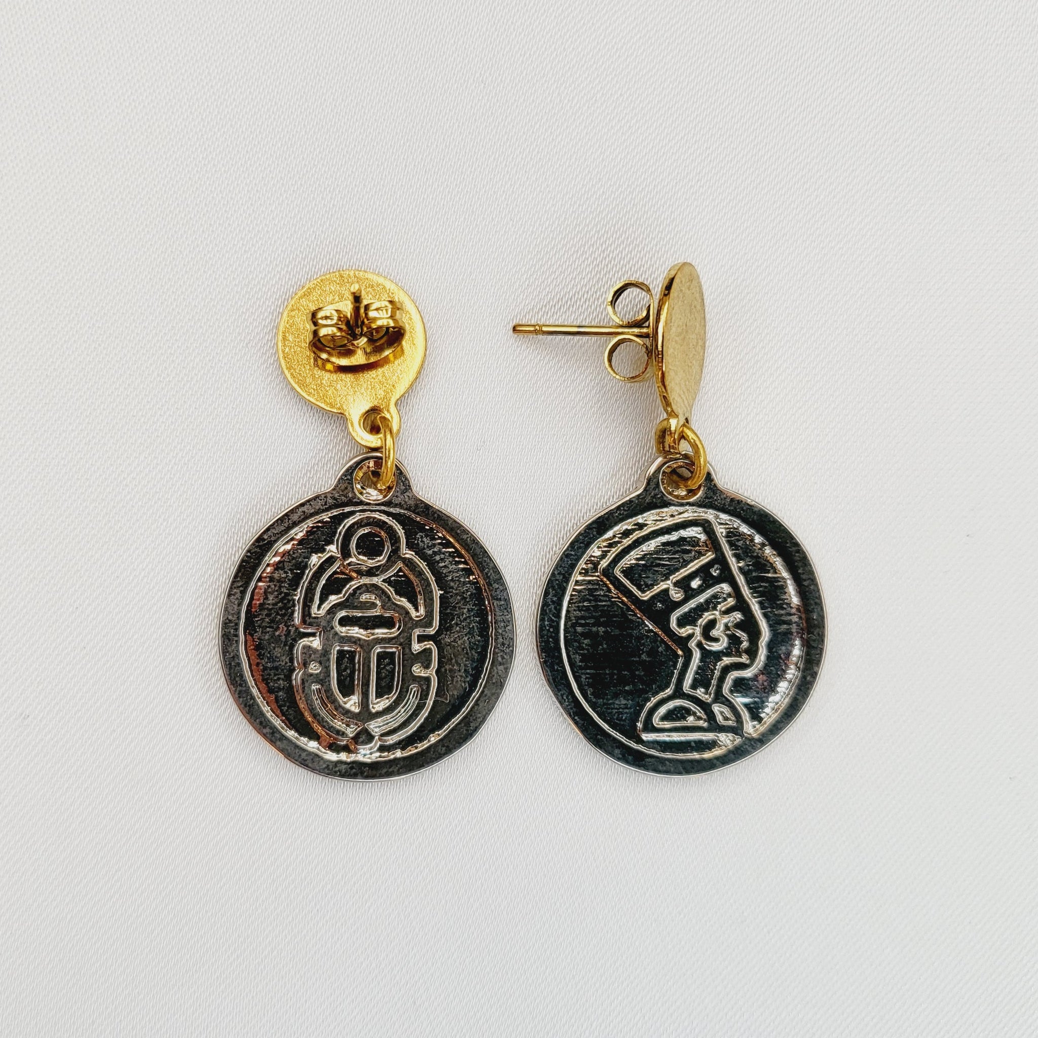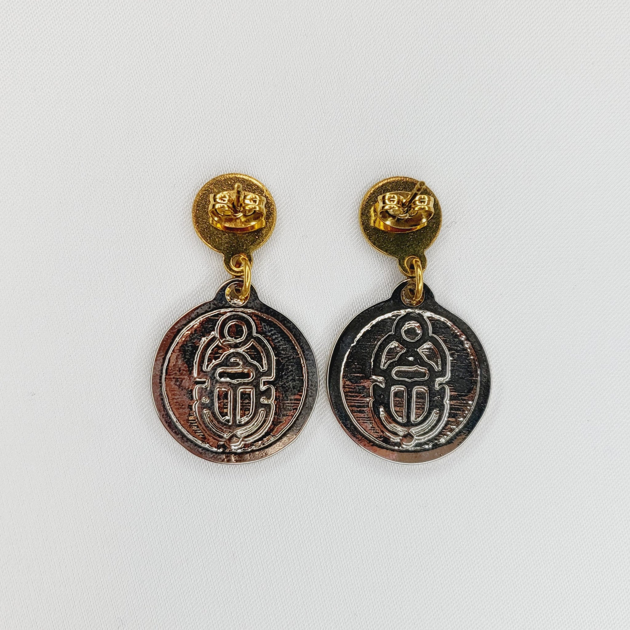Aretes colgantes con broche de chapa de oro y moneda de chapa de plata.