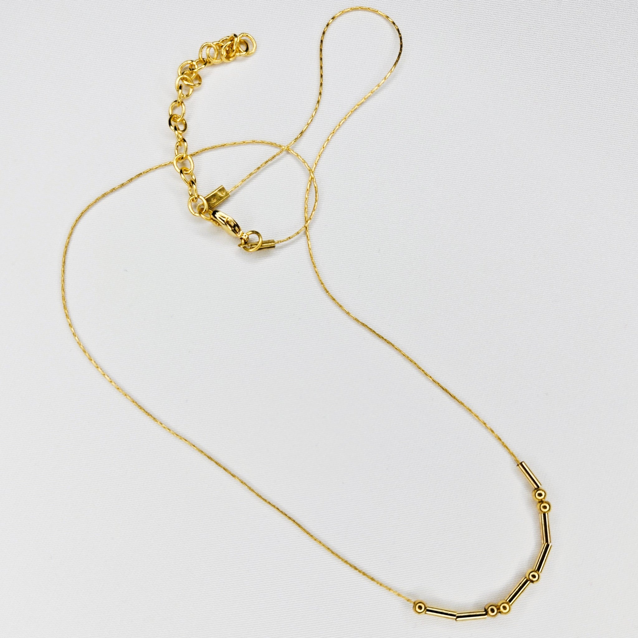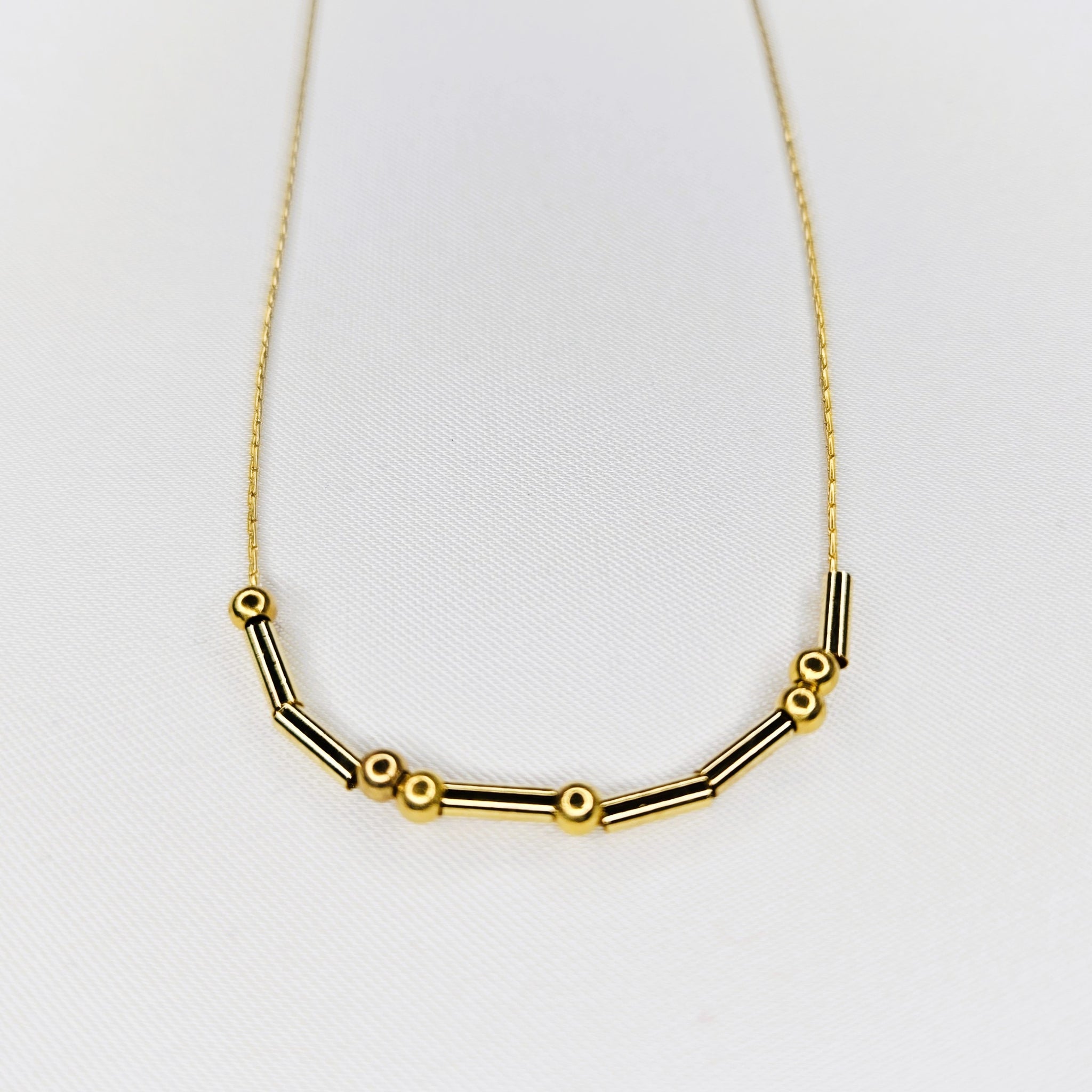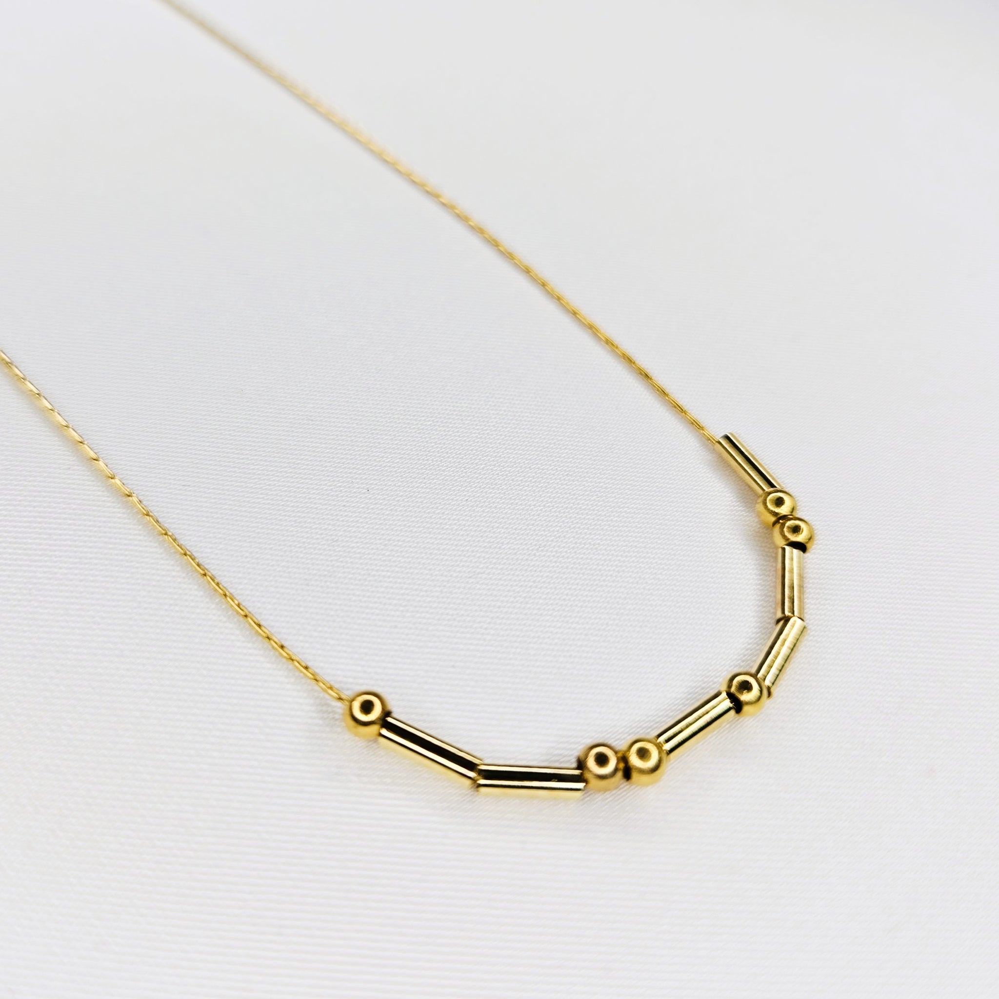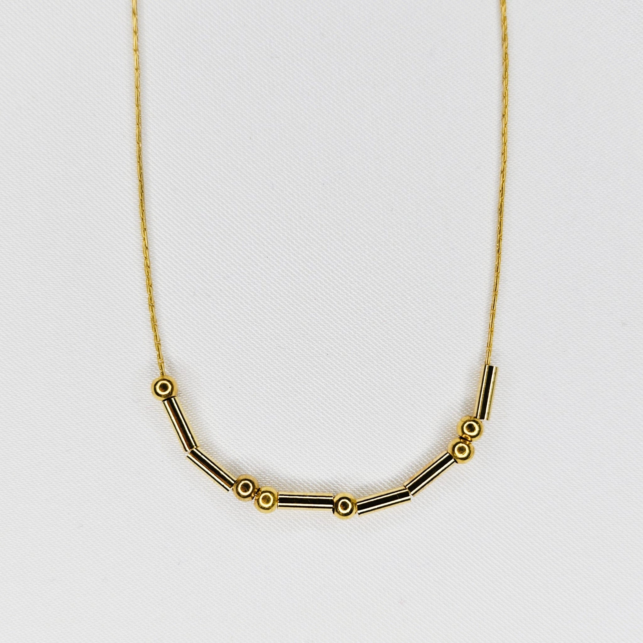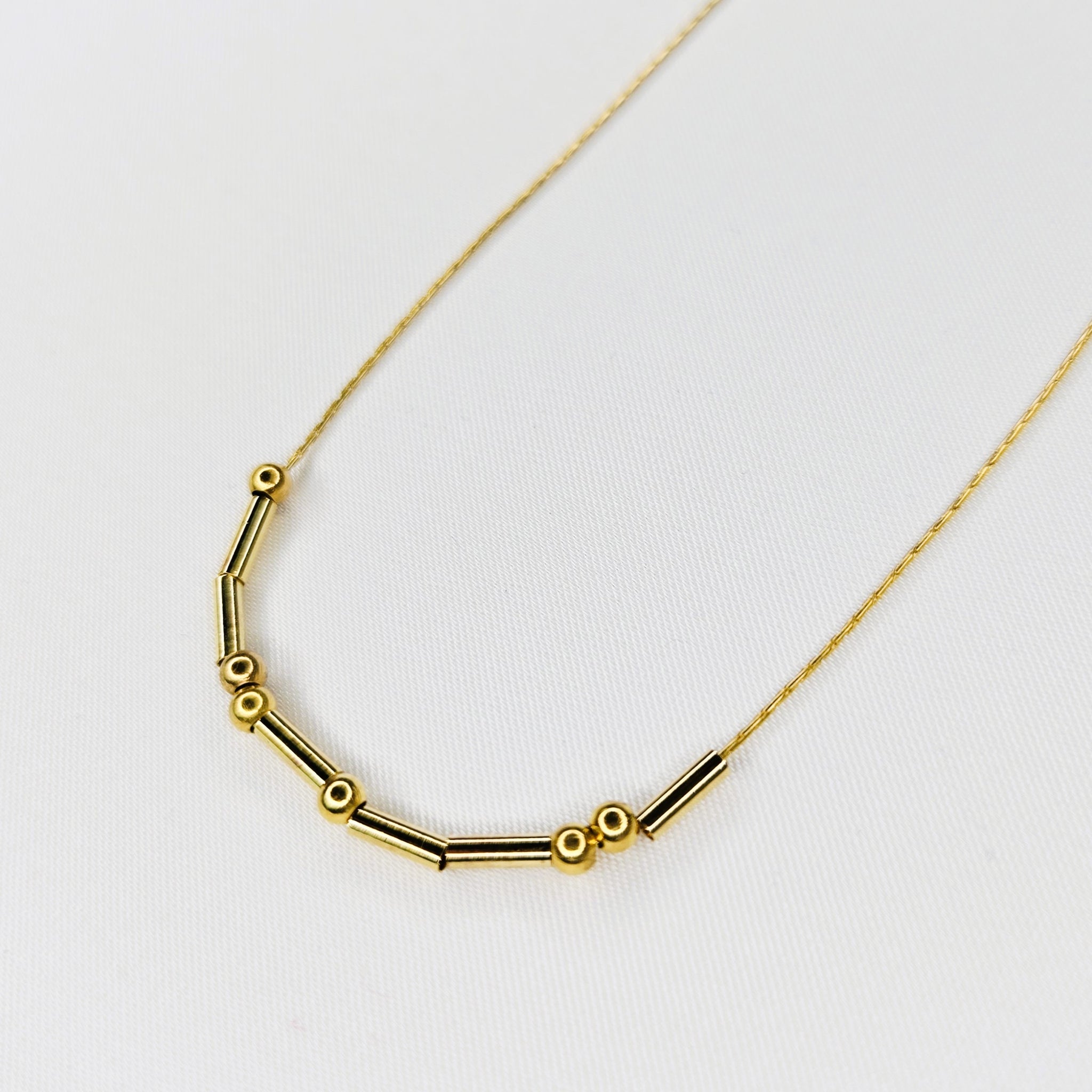 Este delicado collar transmite un mensaje único en clave Morse, formado con cadena, broche, cuentas y abalorios bañados en chapa de oro. Cada punto y raya se convierte en un detalle elegante, creando una joya personalizada, discreta y significativa. Ideal para regalar o llevar un mensaje especial cerca del corazón.