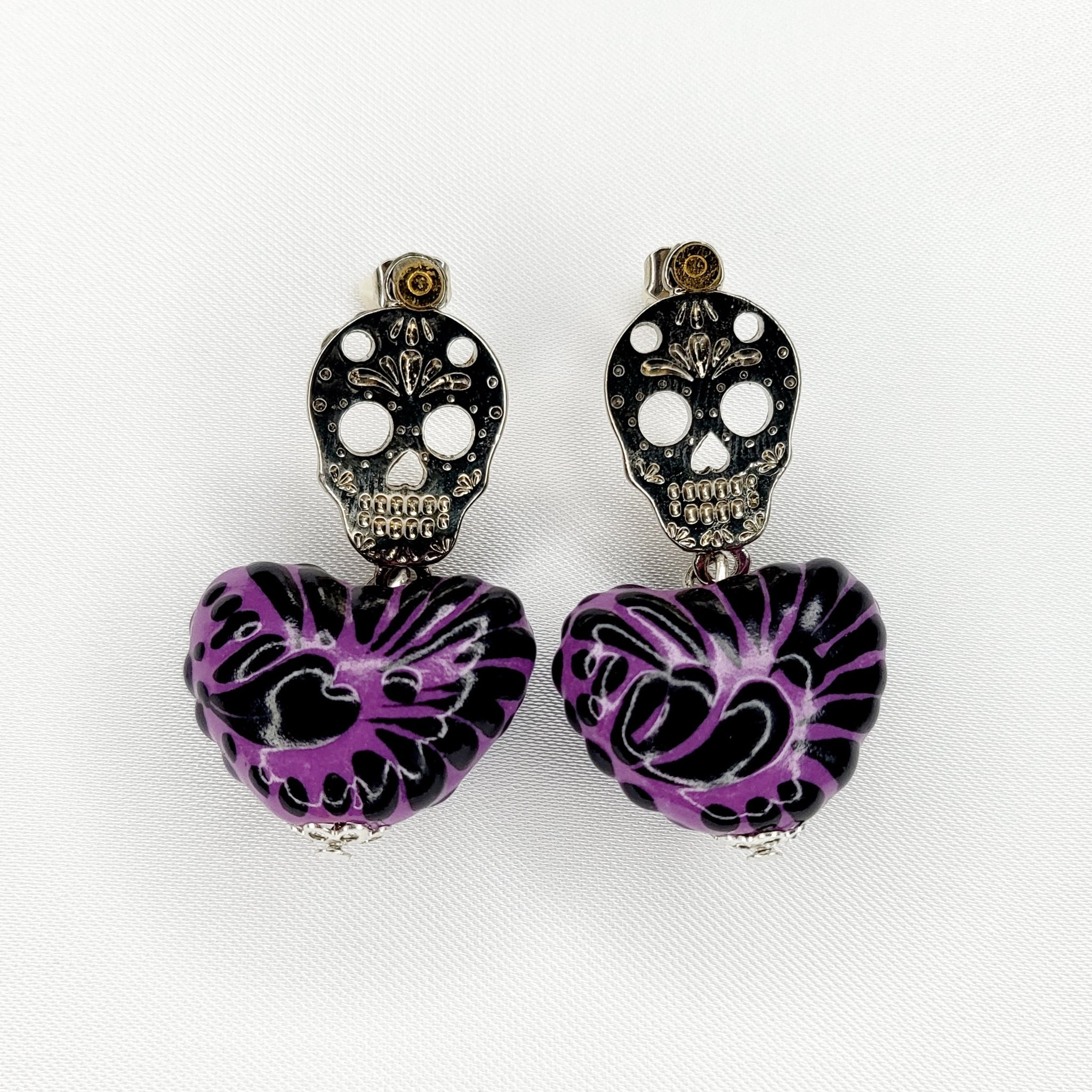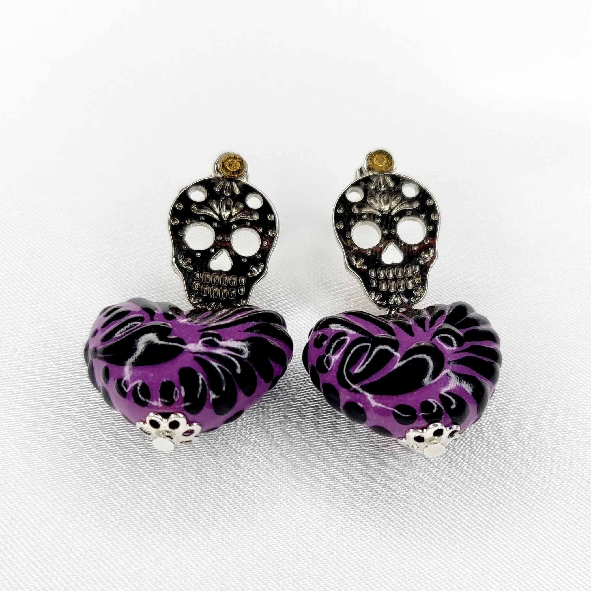 Aretes colgantes con dije de plata en forma de calavera y corazón morado de Talavera.