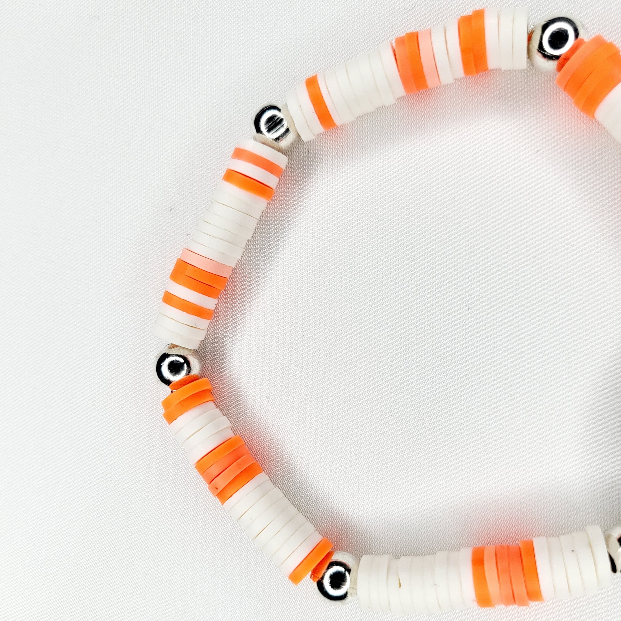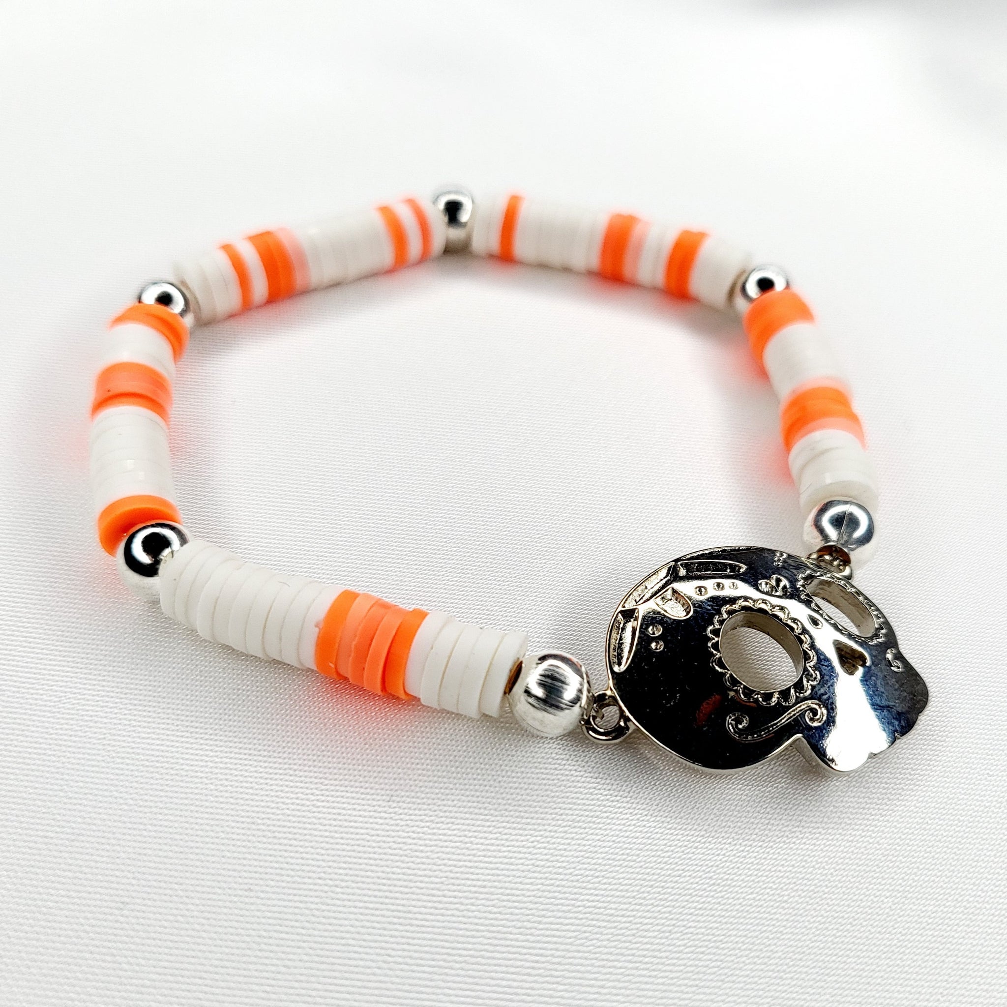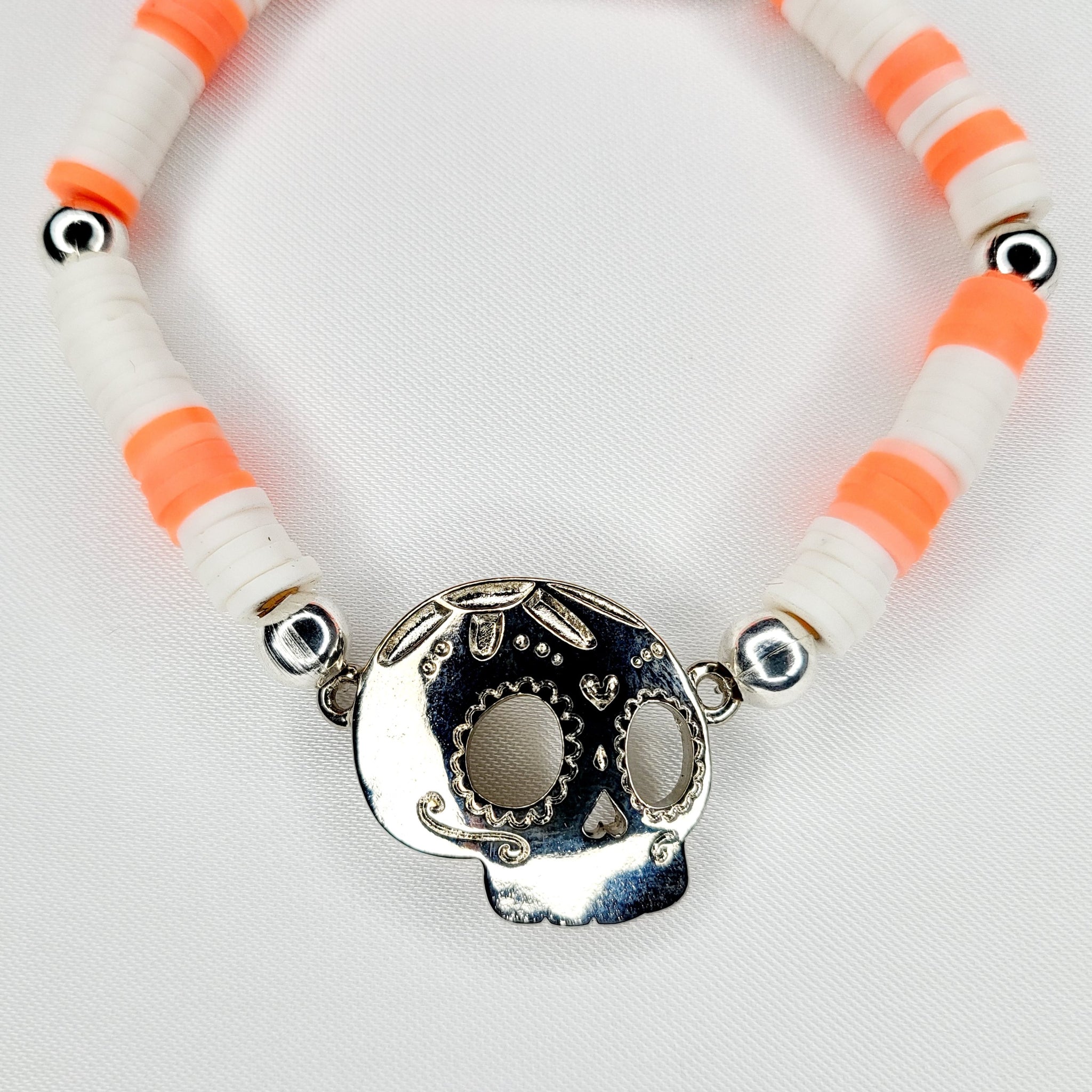 Conmemorando el Día de Muertos, esta pulsera elástica con cuentas de caucho naranjas y blancas y cuentas y dije de plata, resalta otro ícono que representa esta festividad, la calavera de chocolate.