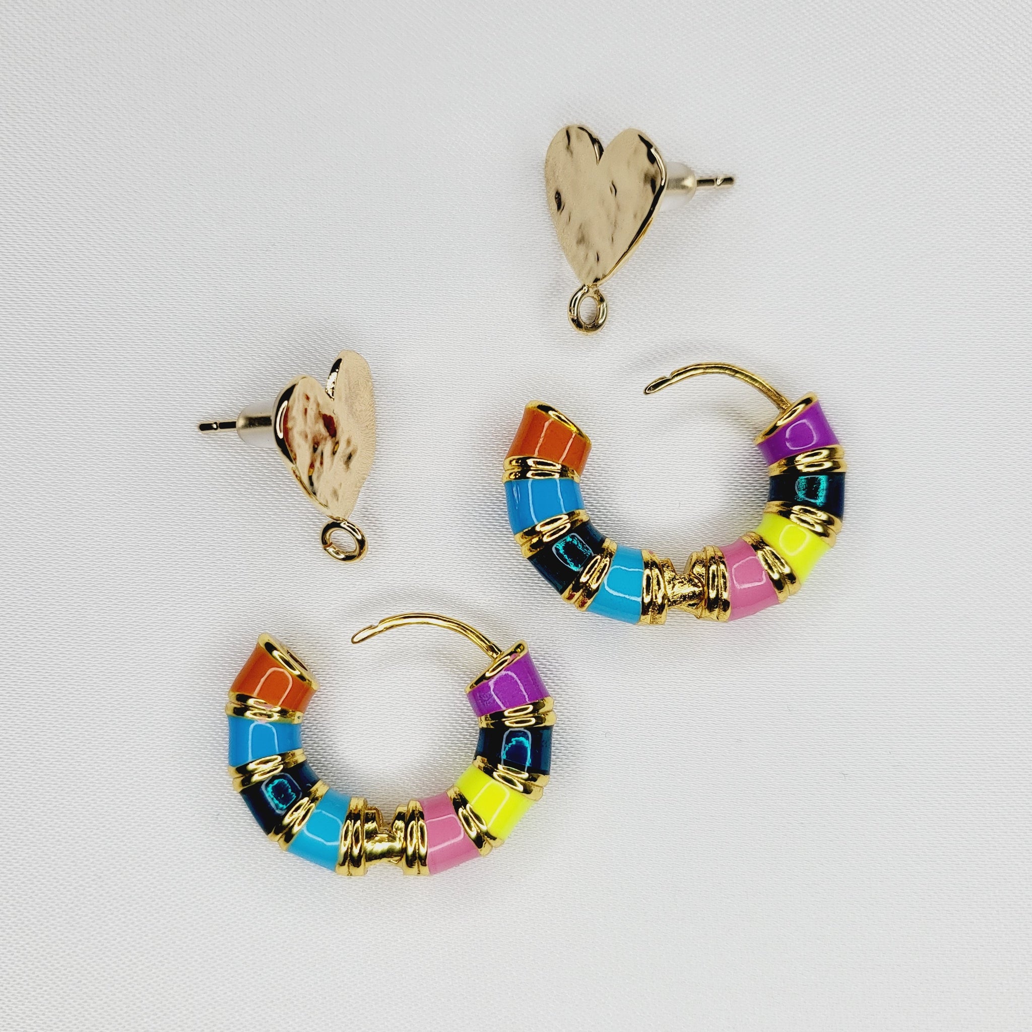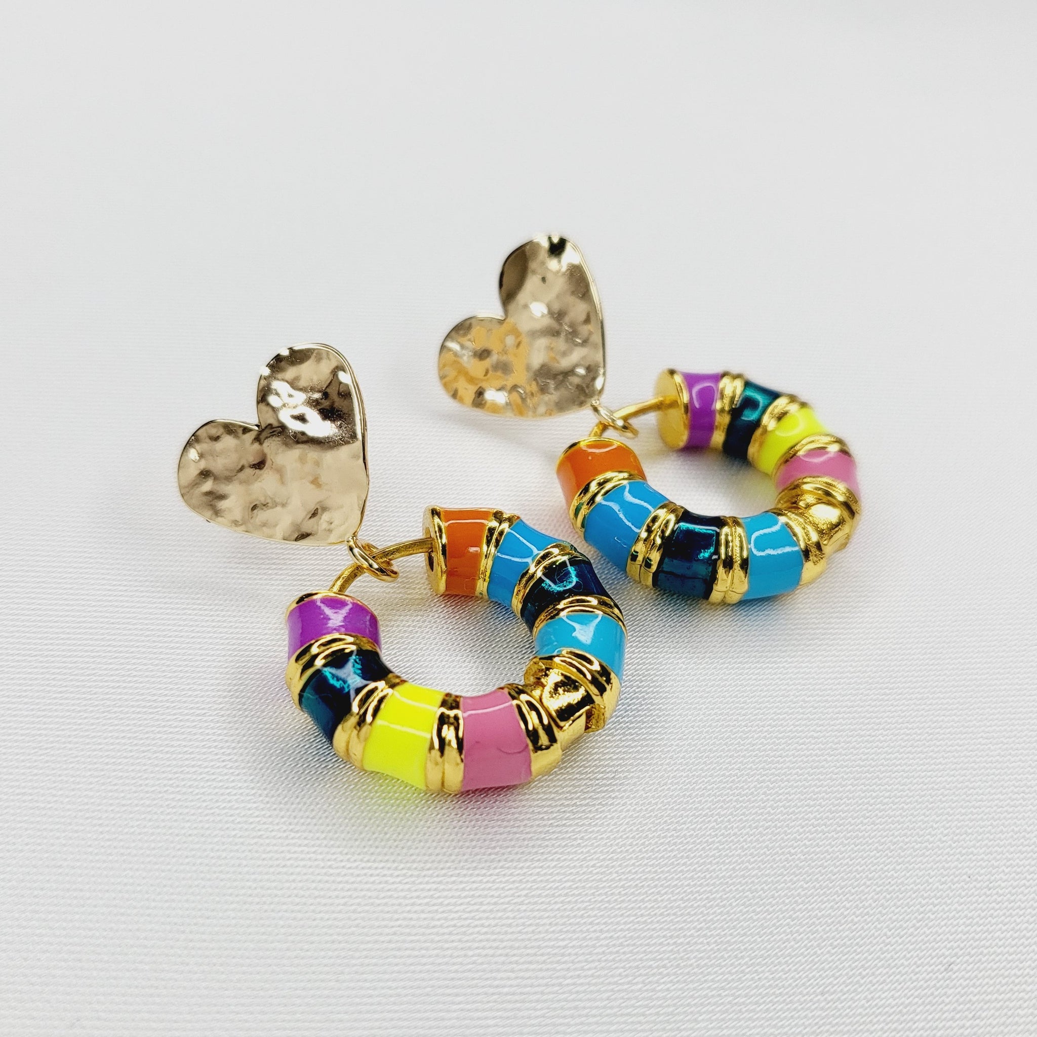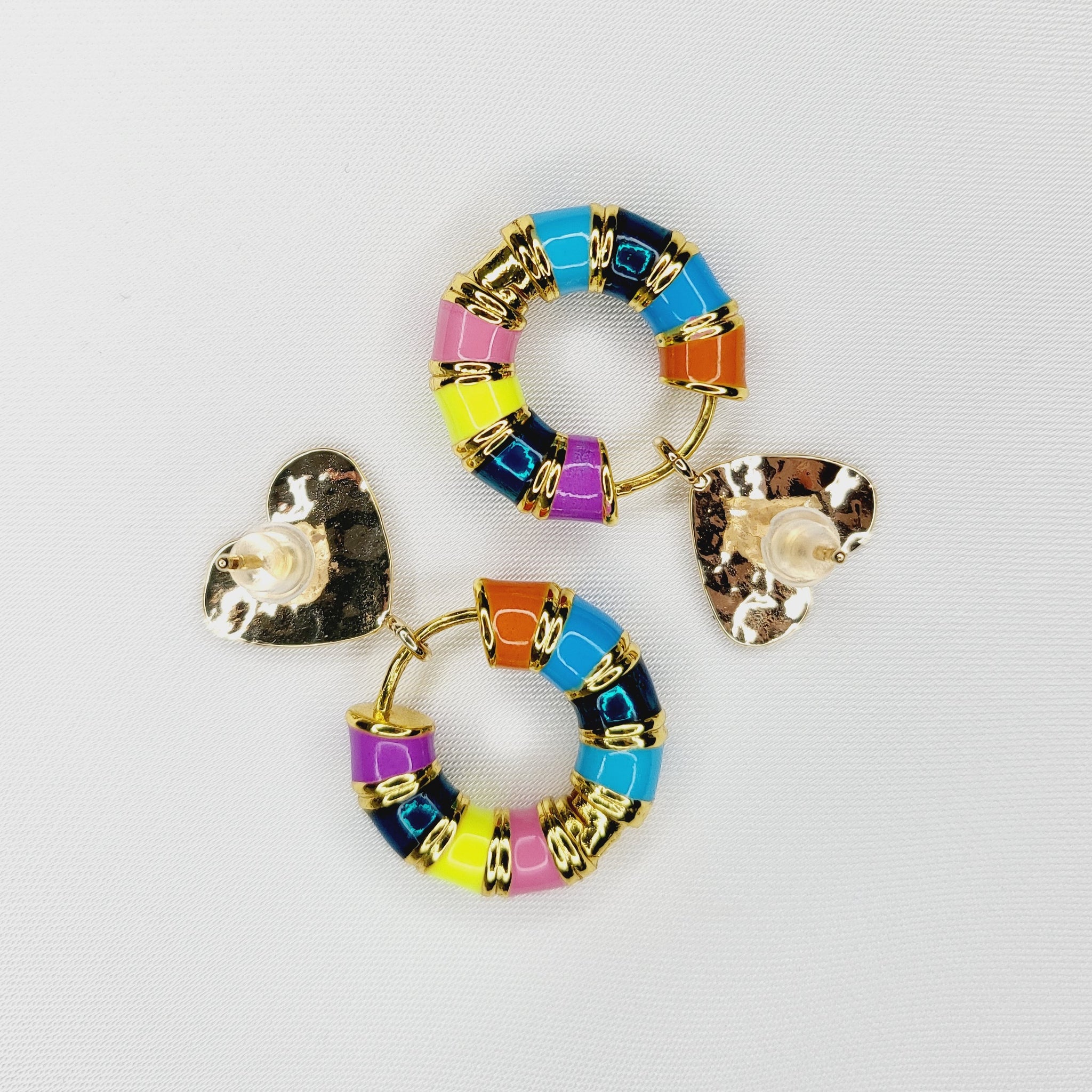 Aretes colgantes con dijes de chapa de oro en forma de corazón. Arracada en chapa de oro con resina de colores. Largo 3 cm y ancho 2 cm. El dije de corazón puede quitarse abriendo el aro de colores y puede usarse solamente como arracada.
