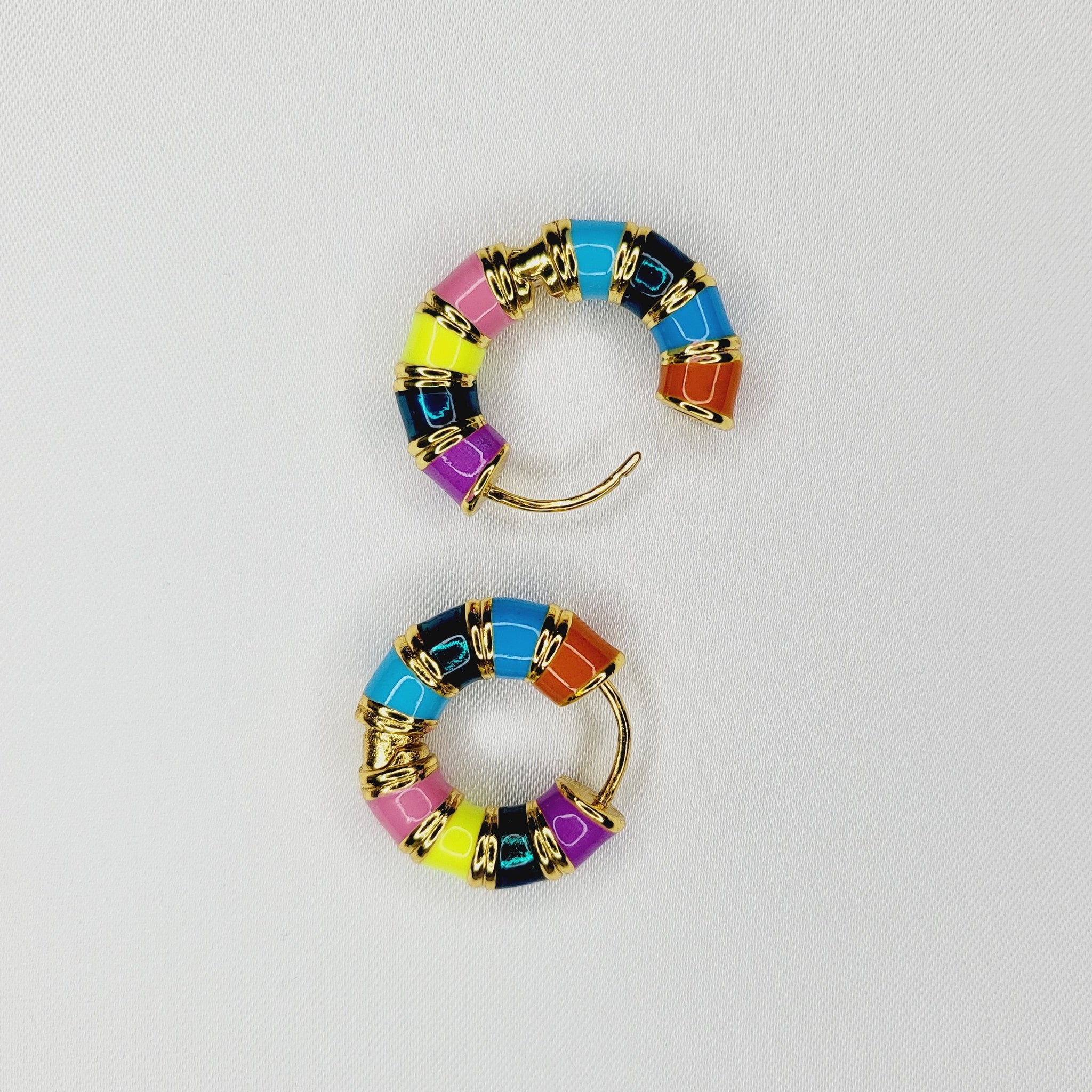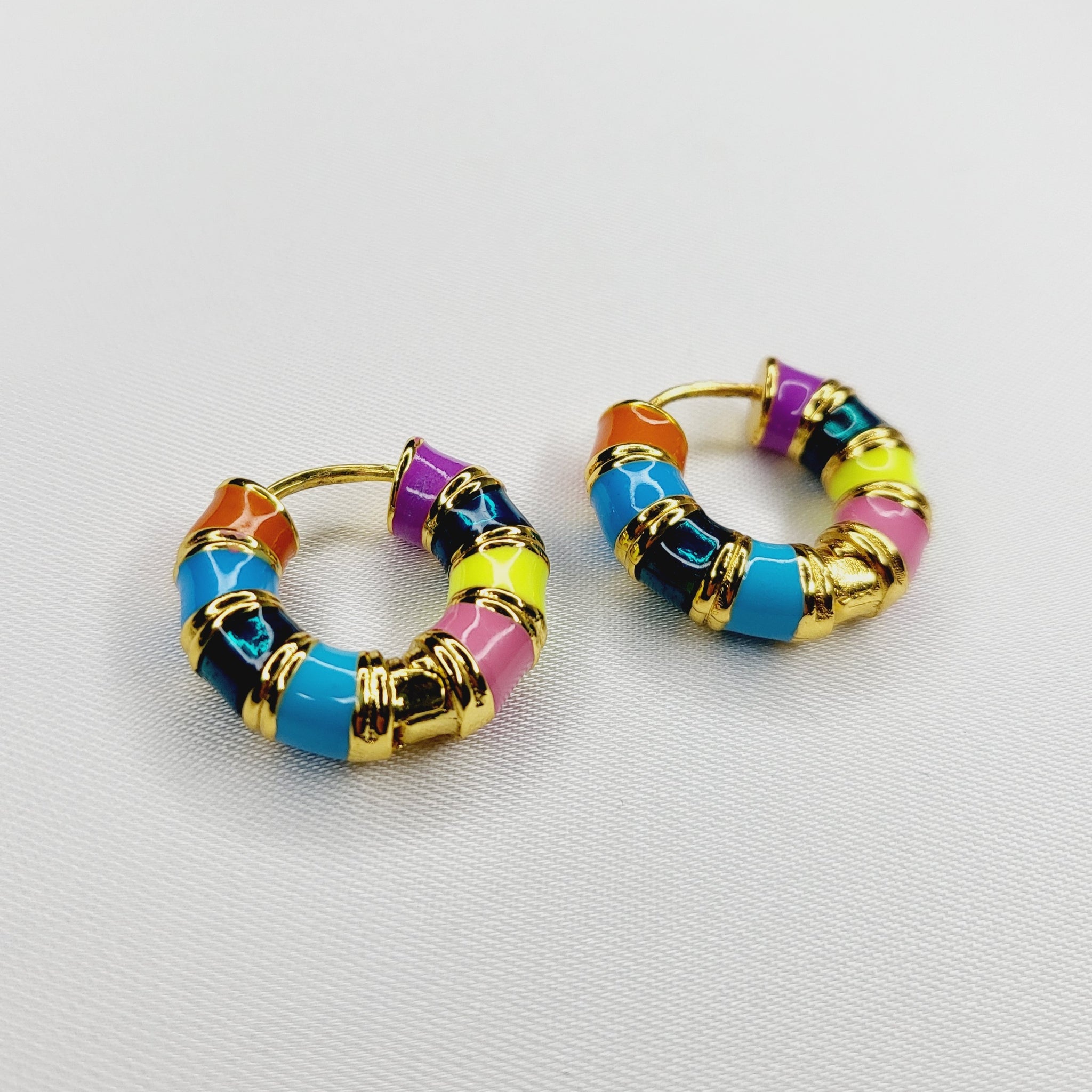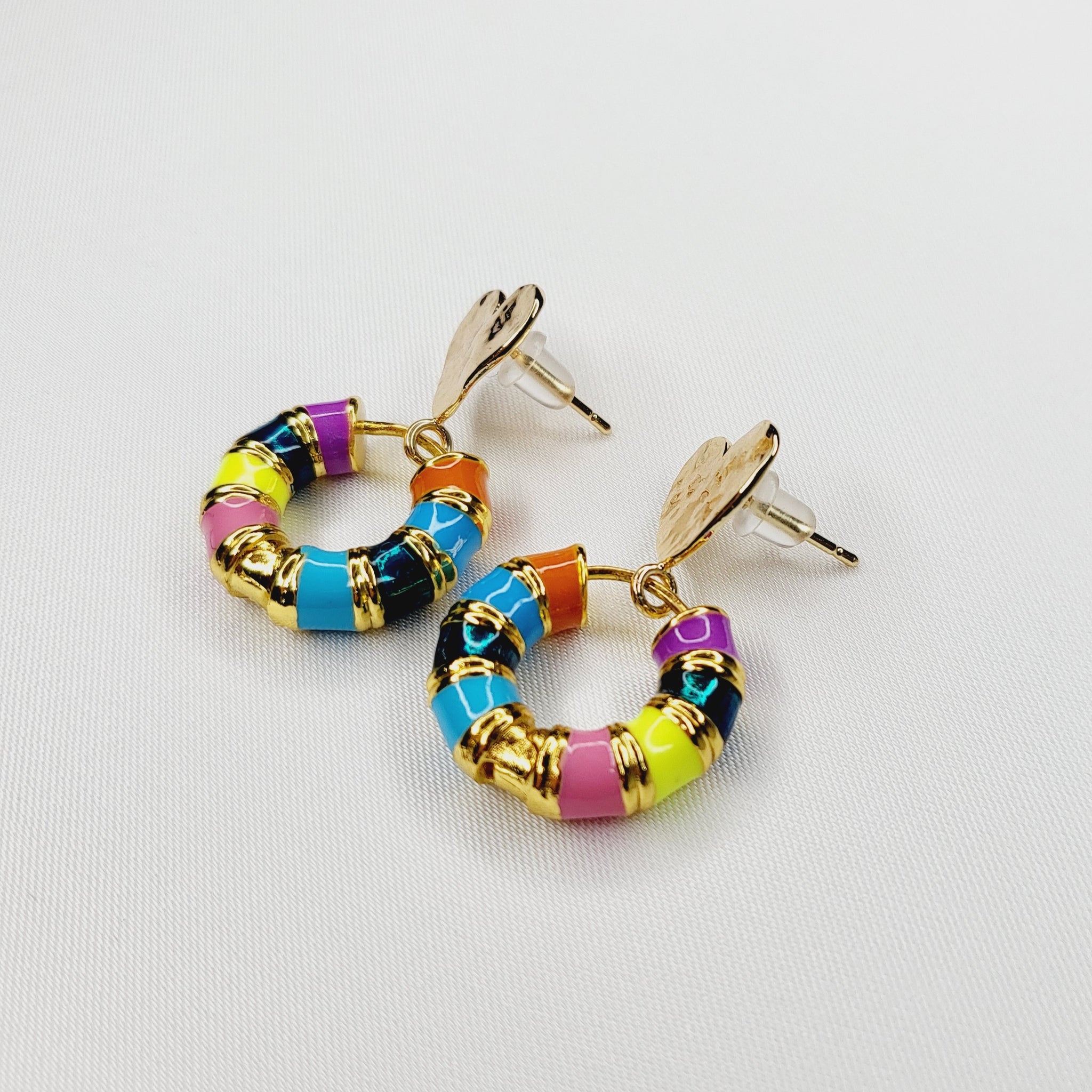 Aretes colgantes con dijes de chapa de oro en forma de corazón. Arracada en chapa de oro con resina de colores. Largo 3 cm y ancho 2 cm. El dije de corazón puede quitarse abriendo el aro de colores y puede usarse solamente como arracada.
