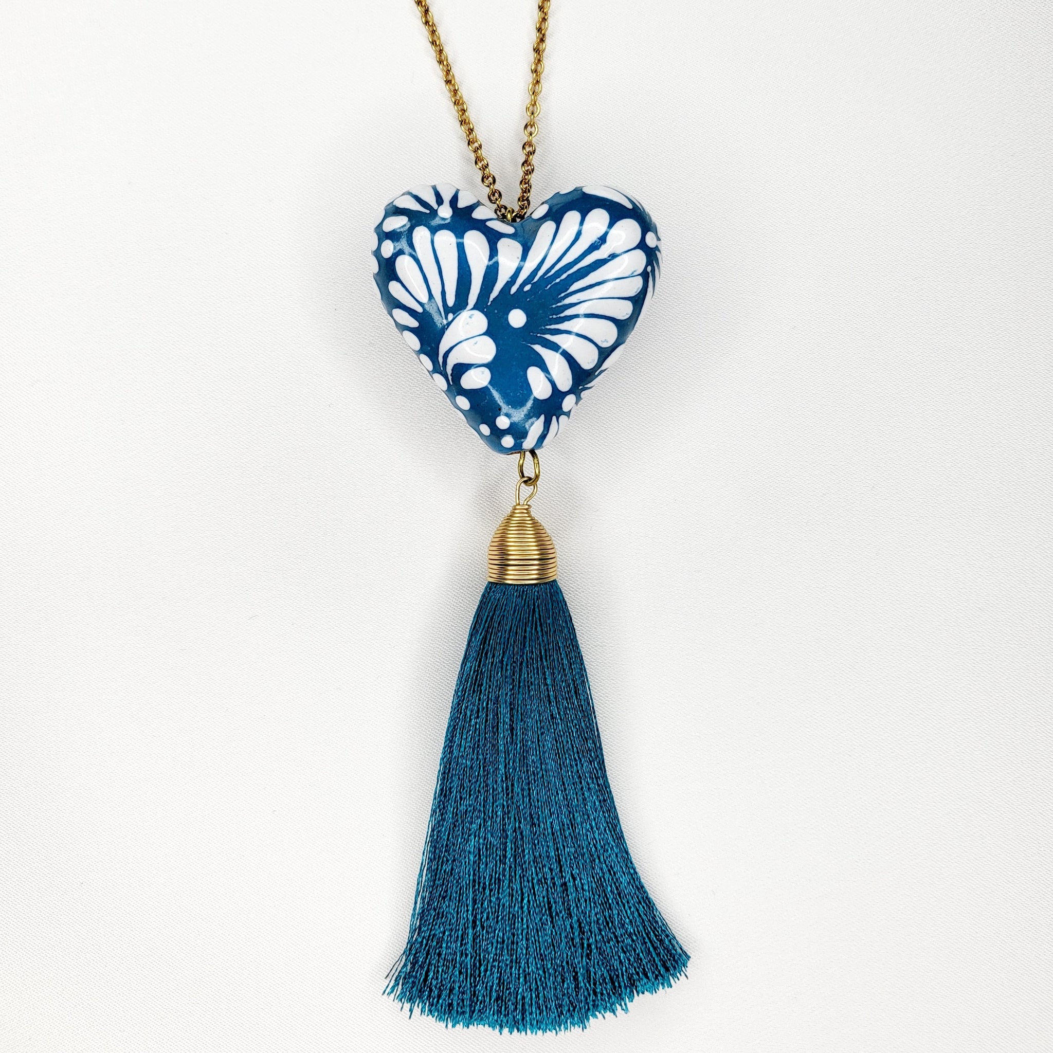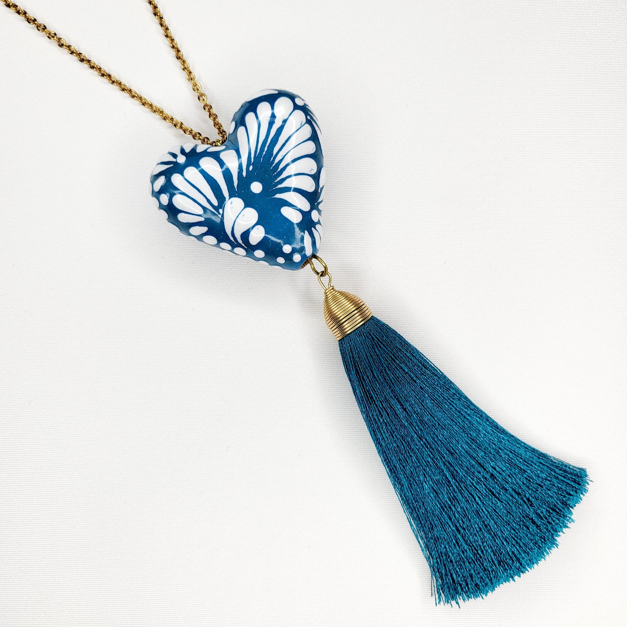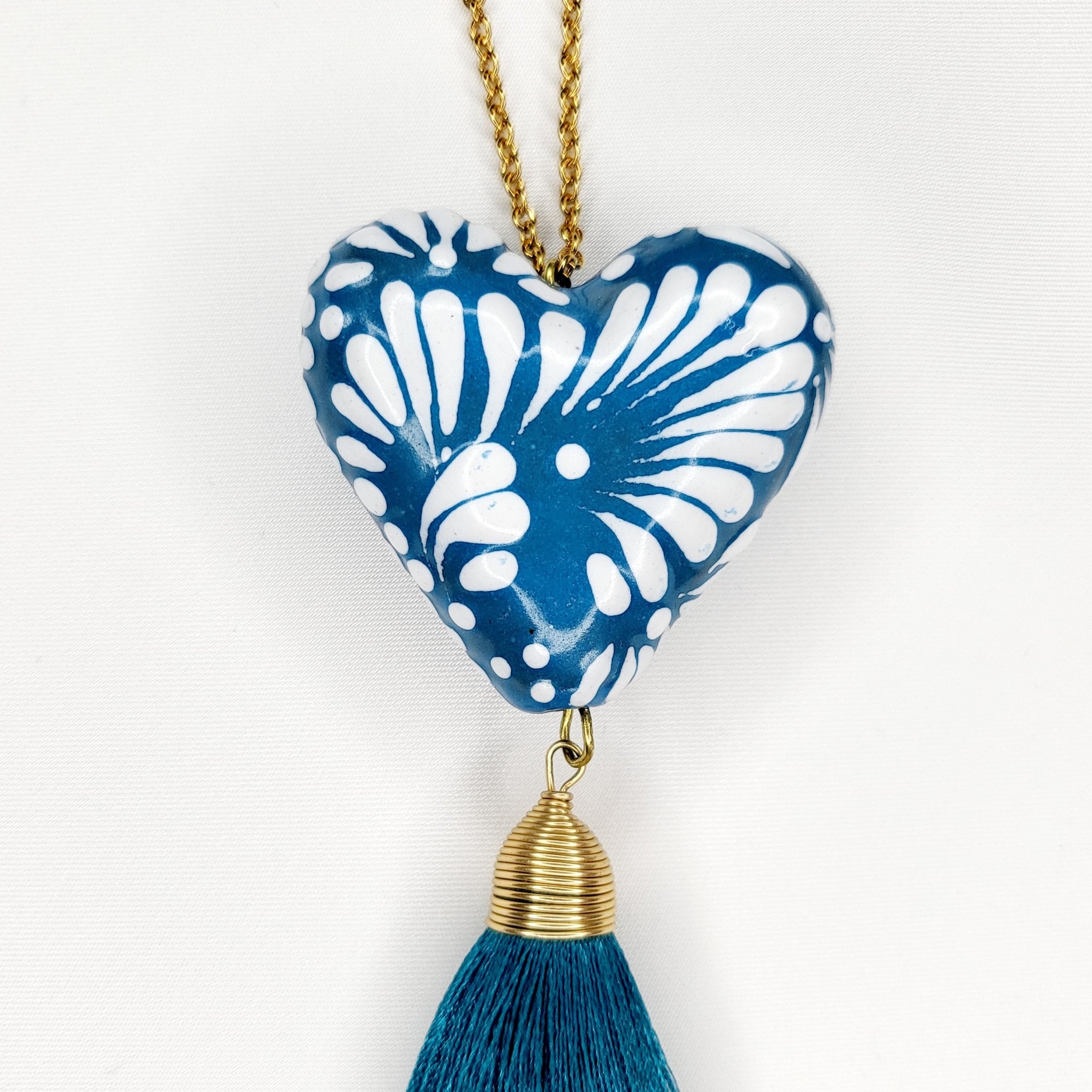 Collar largo con corazón de Talavera pintada a mano, motita de hilo y cadena y broche de chapa de oro. El diseño del corazón puede variar, ya que al ser hecho a mano, salen piezas con diseños únicos. El corazón mide aproximadamente 4 x 3.5 cm. El largo del collar es ajustable.