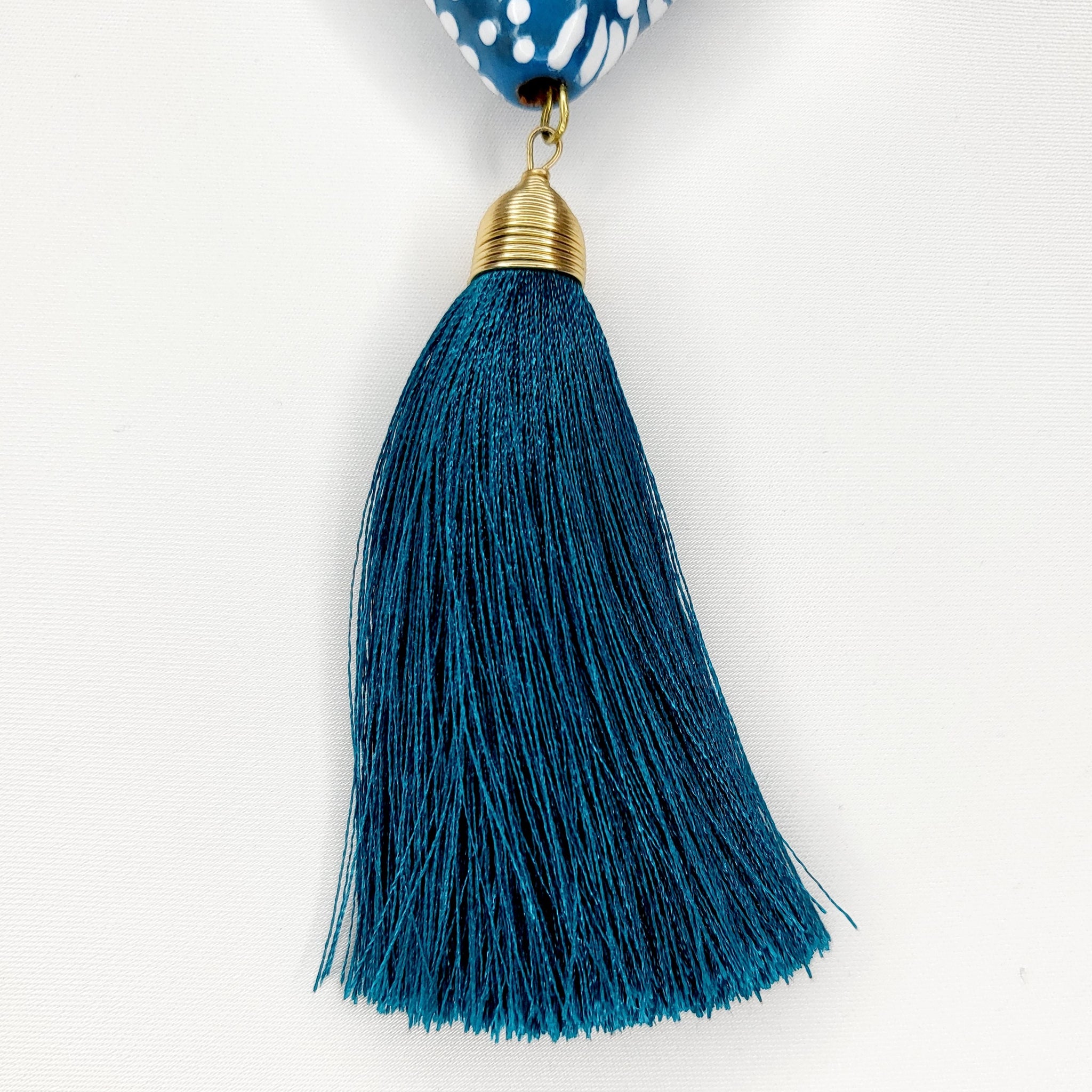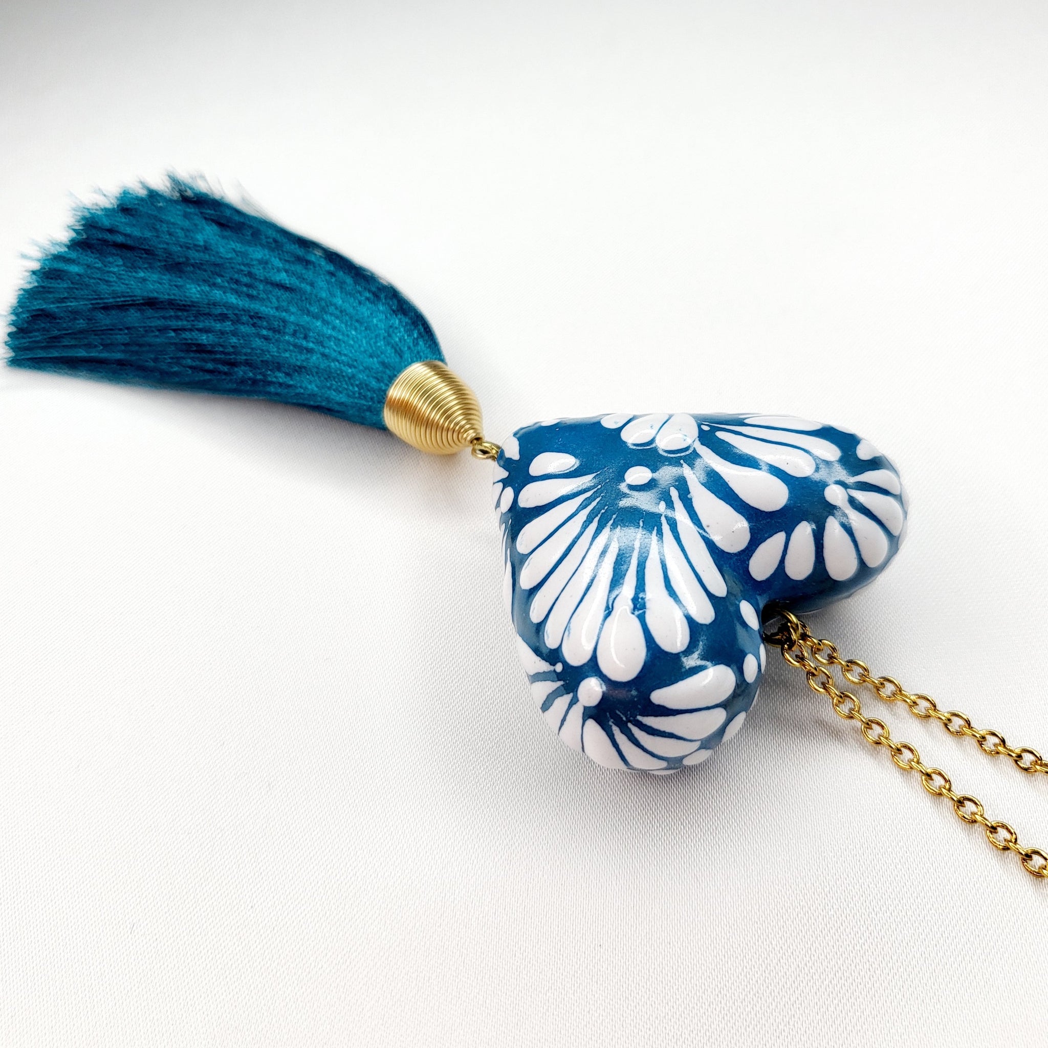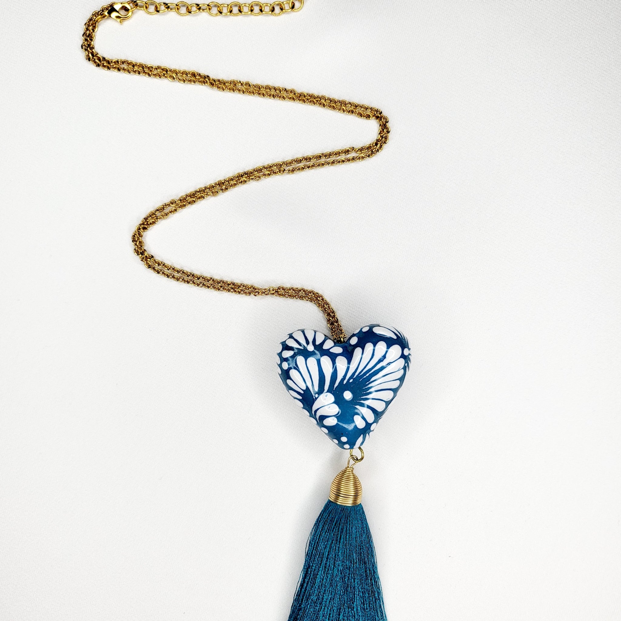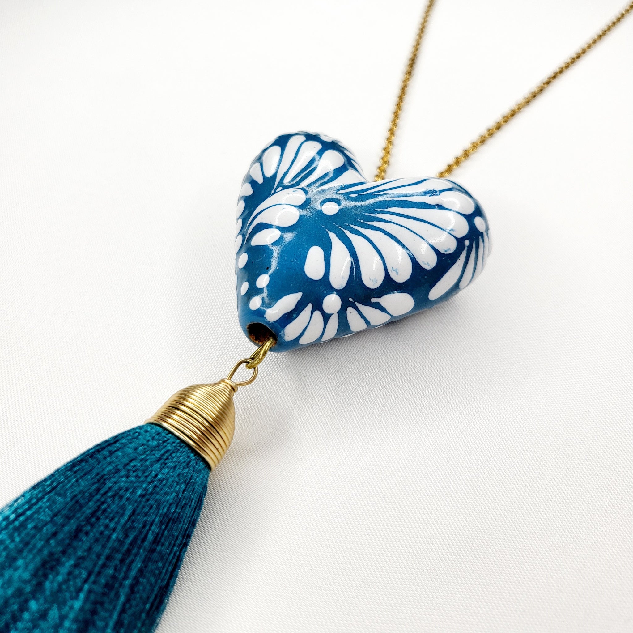 Collar largo con corazón de Talavera pintada a mano, motita de hilo y cadena y broche de chapa de oro. El diseño del corazón puede variar, ya que al ser hecho a mano, salen piezas con diseños únicos. El corazón mide aproximadamente 4 x 3.5 cm. El largo del collar es ajustable.