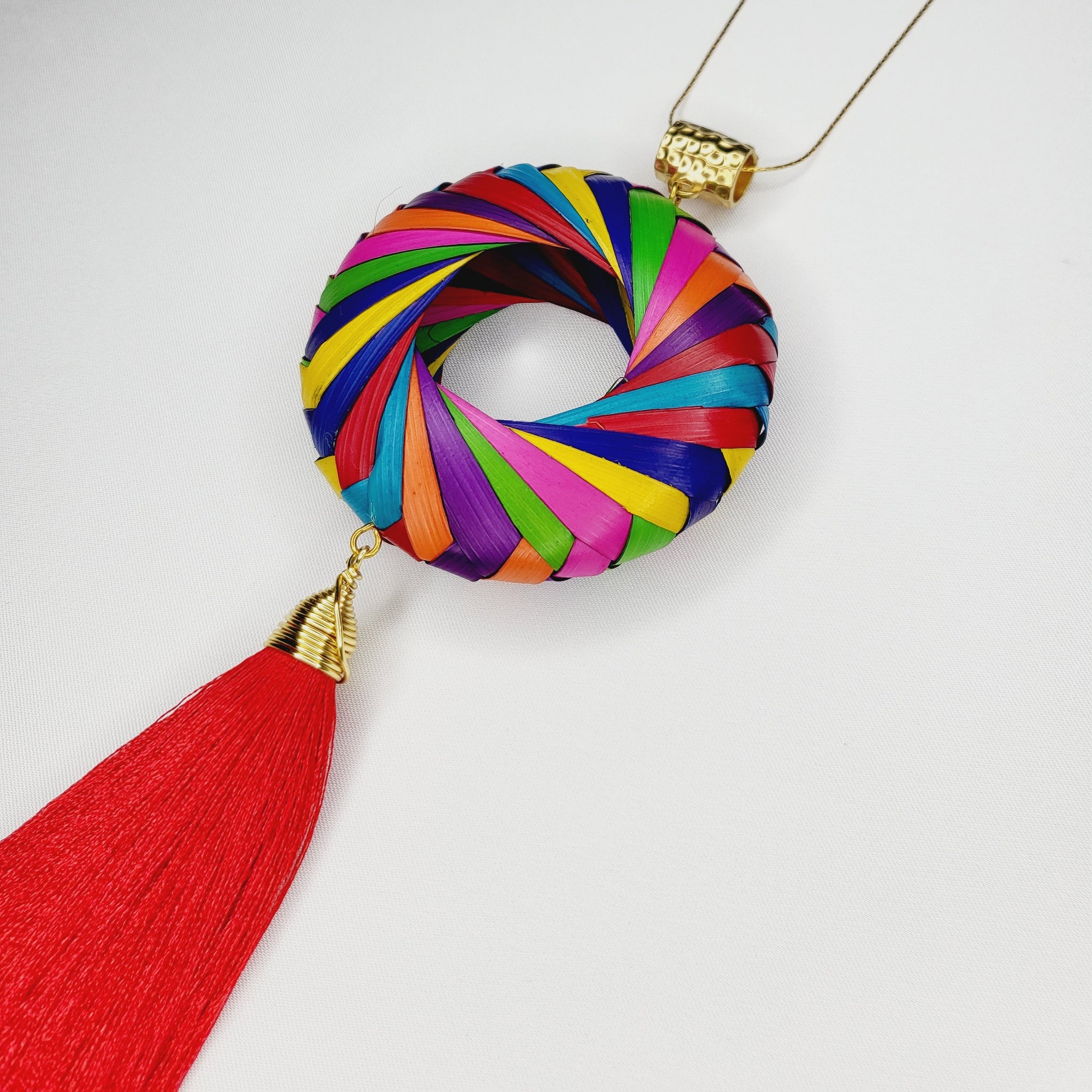 Collar largo con cadena y broche de chapa de oro, aro de palma teñido tejido a mano, y motita larga de hilo. Largo ajustable.