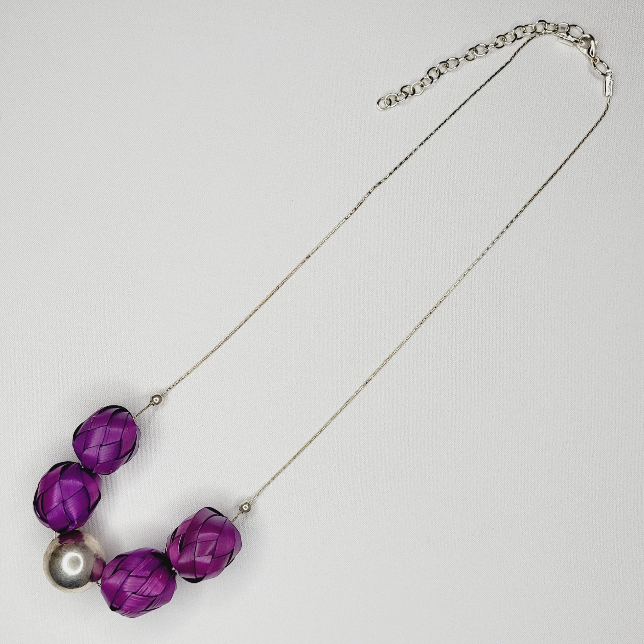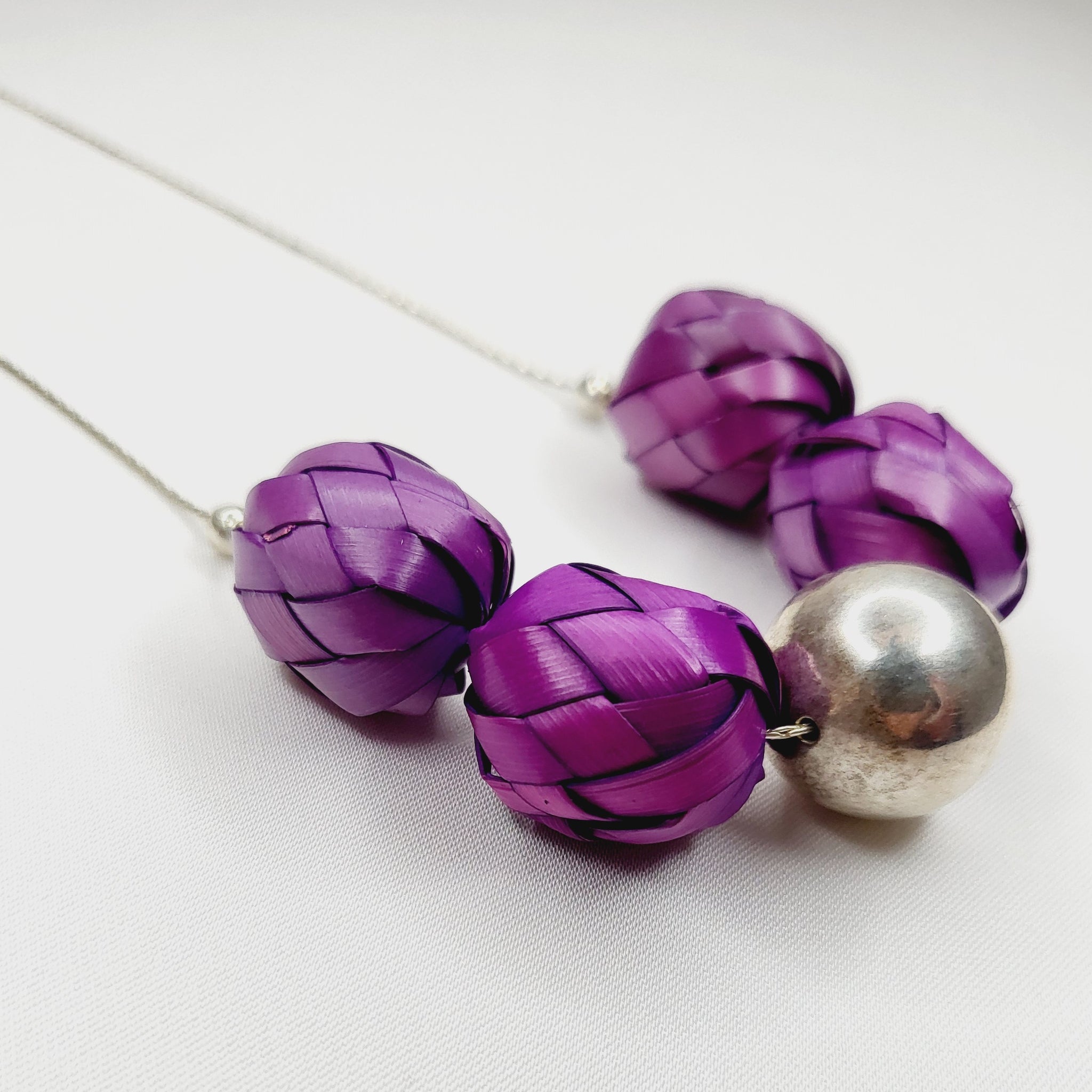Collar corto con esferas de palma teñidas y tejidas a mano con esfera, cadena y broche de chapa de plata. Largo ajustable.