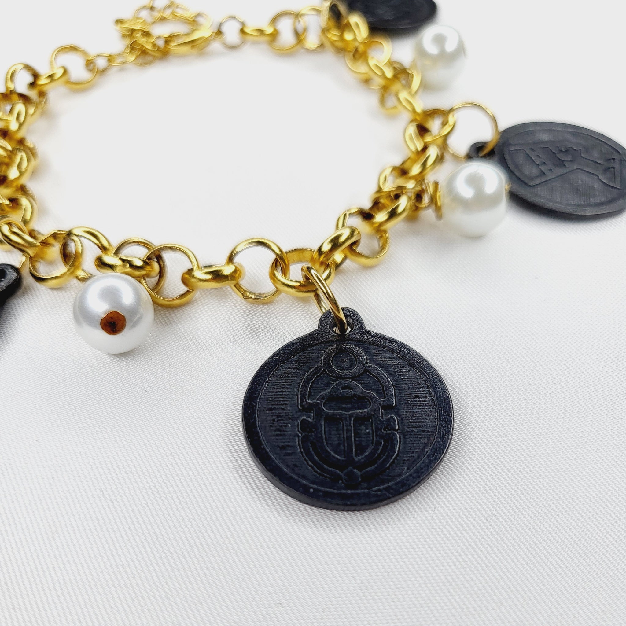 Pulsera con cadena y broche de chapa de oro, perlas de cristal y monedas de chapa satinada.
