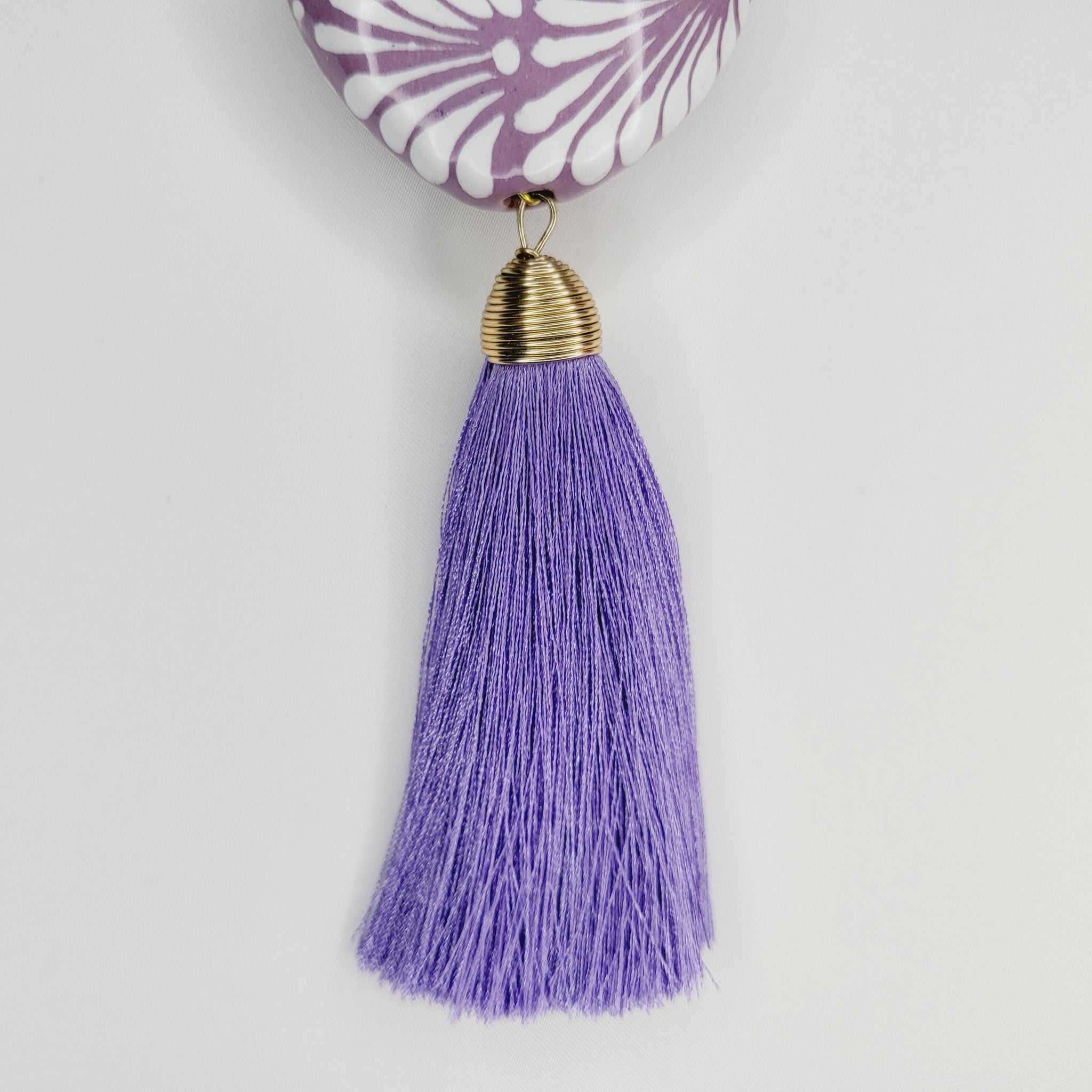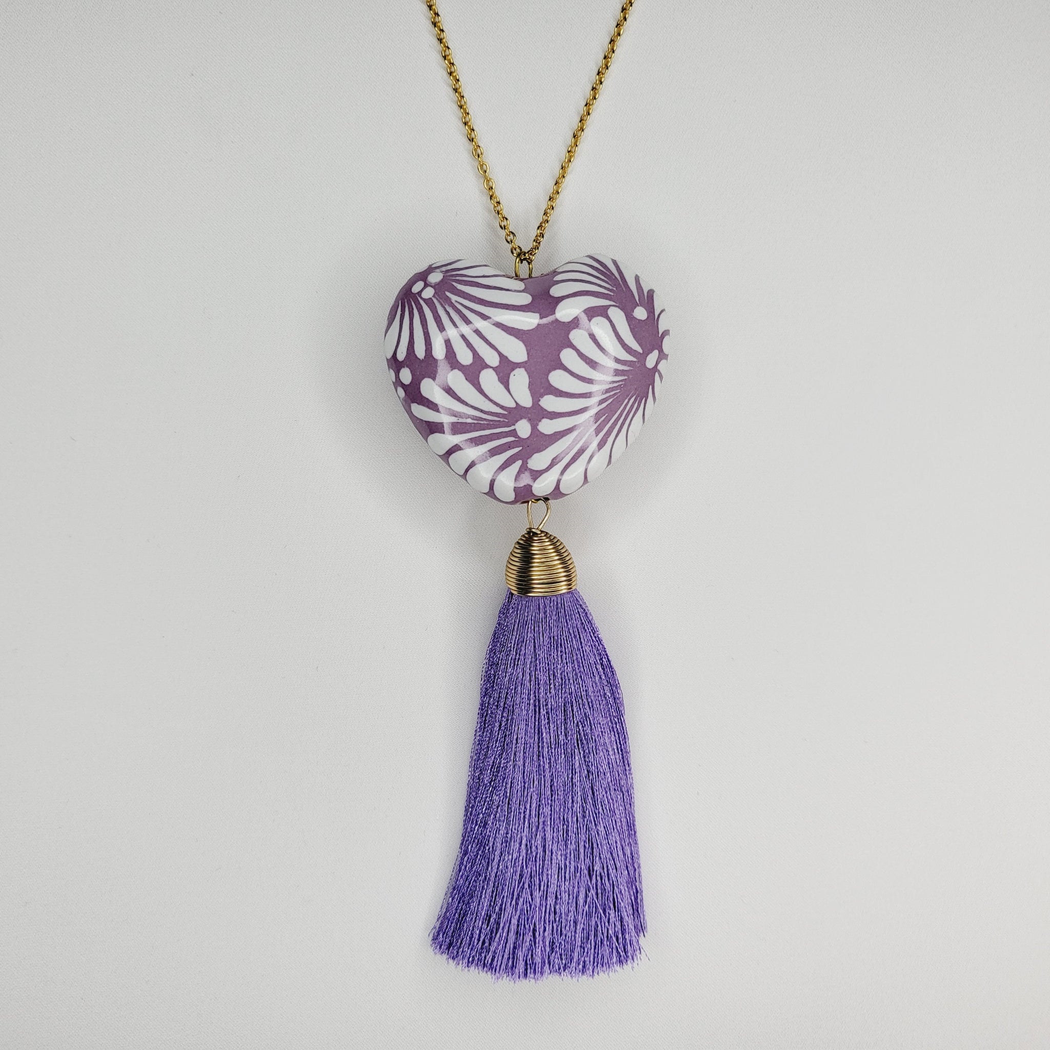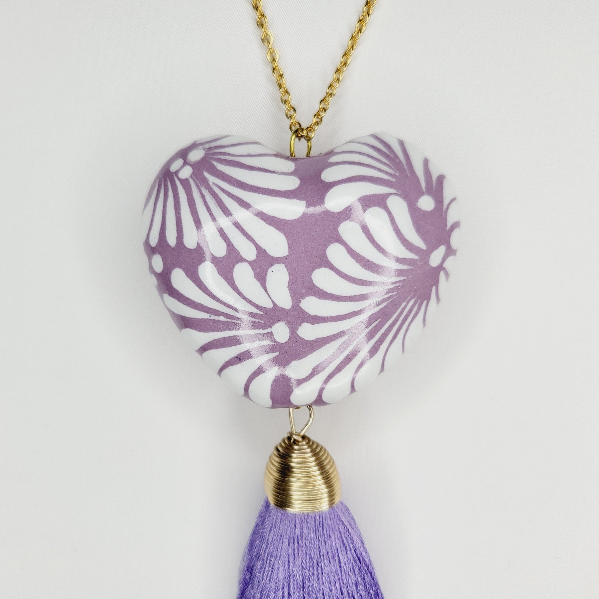 Collar largo con corazón grande de Talavera pintada a mano, motita de hilo y cadena y broche de chapa de oro. El diseño del corazón puede variar, ya que al ser hecho a mano, salen piezas con diseños únicos. El corazón mide aproximadamente 4 x 5 cm. El largo del collar es ajustable.