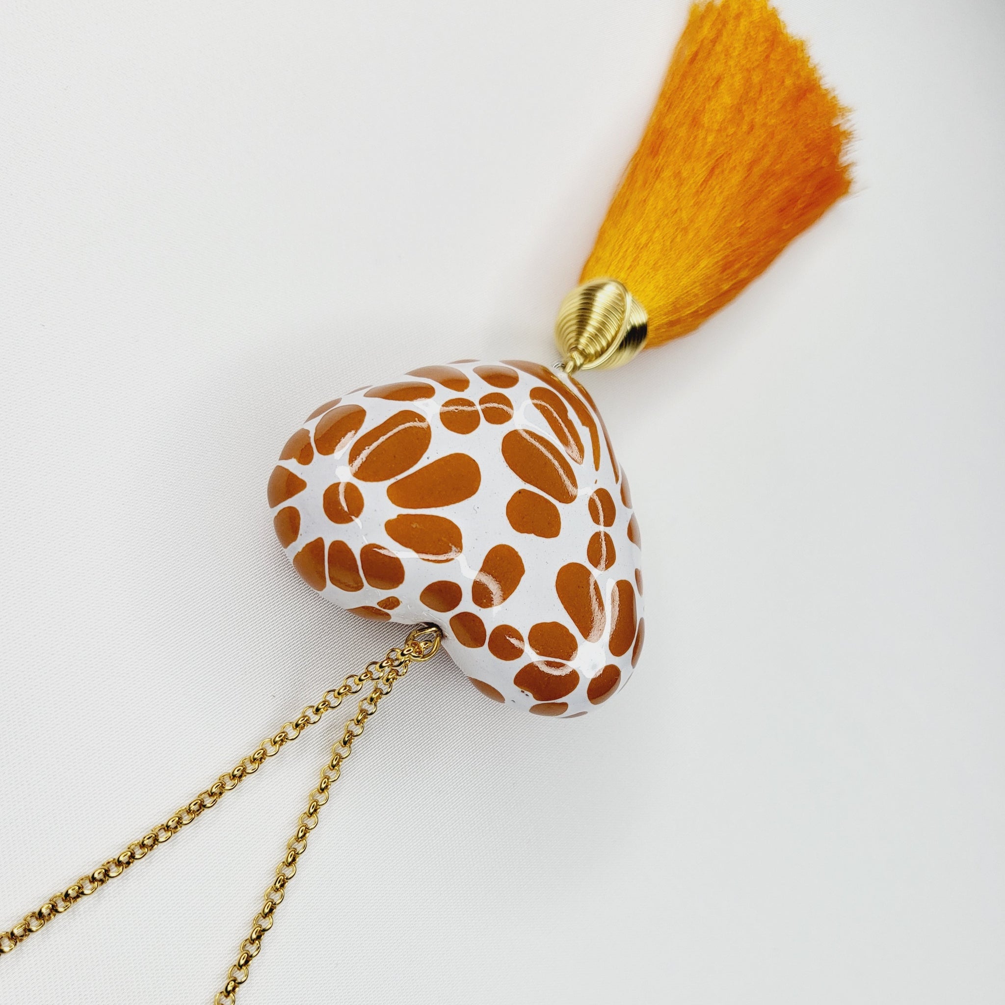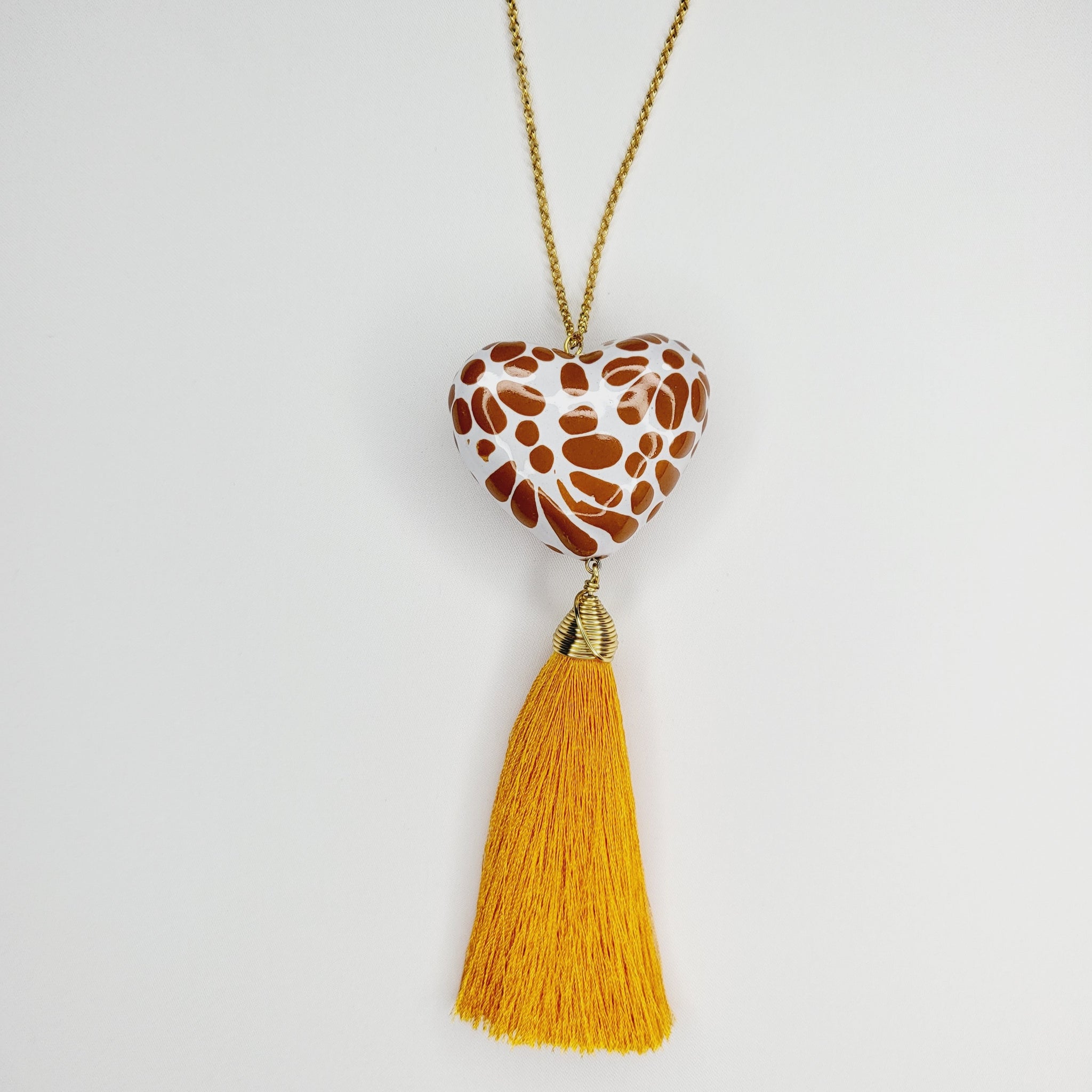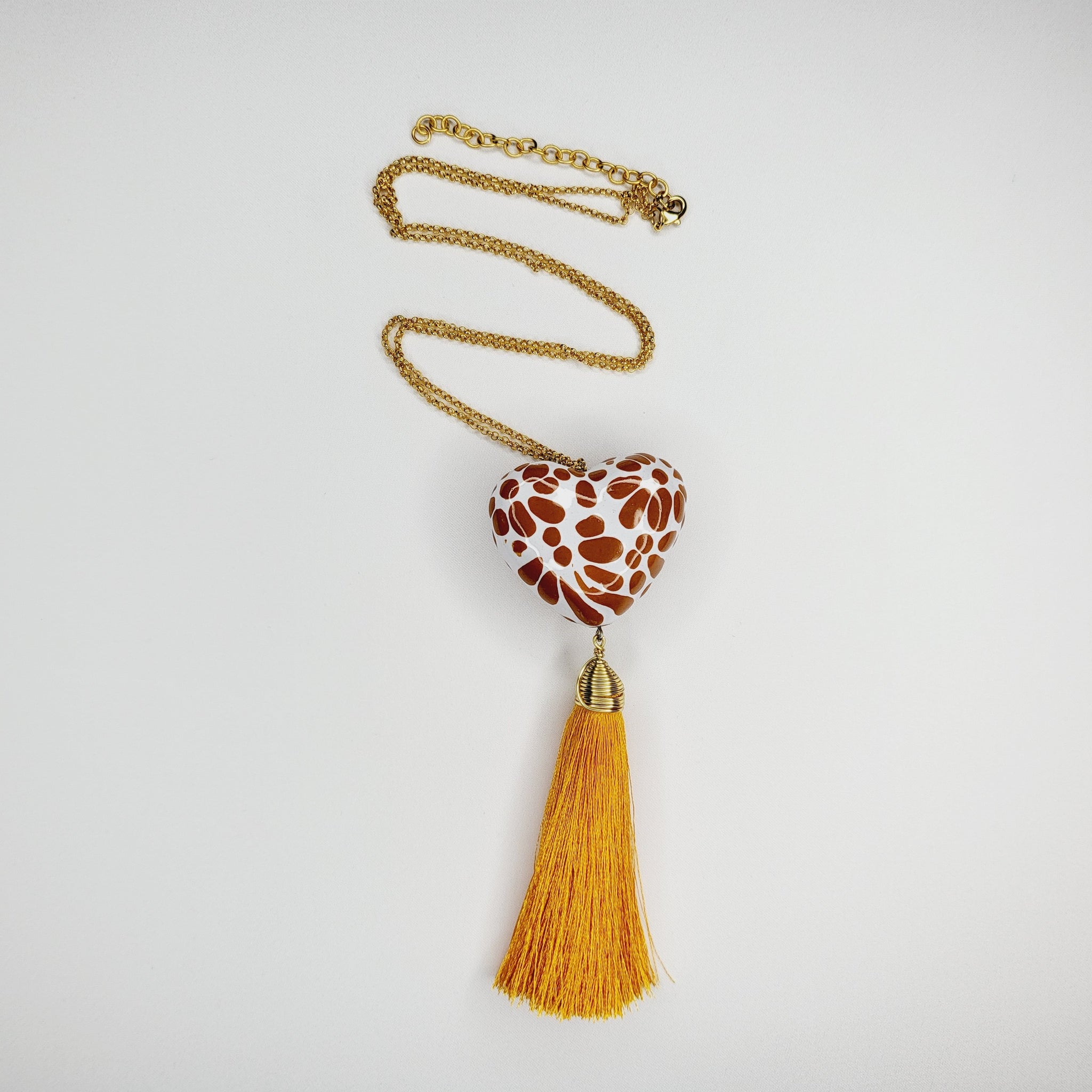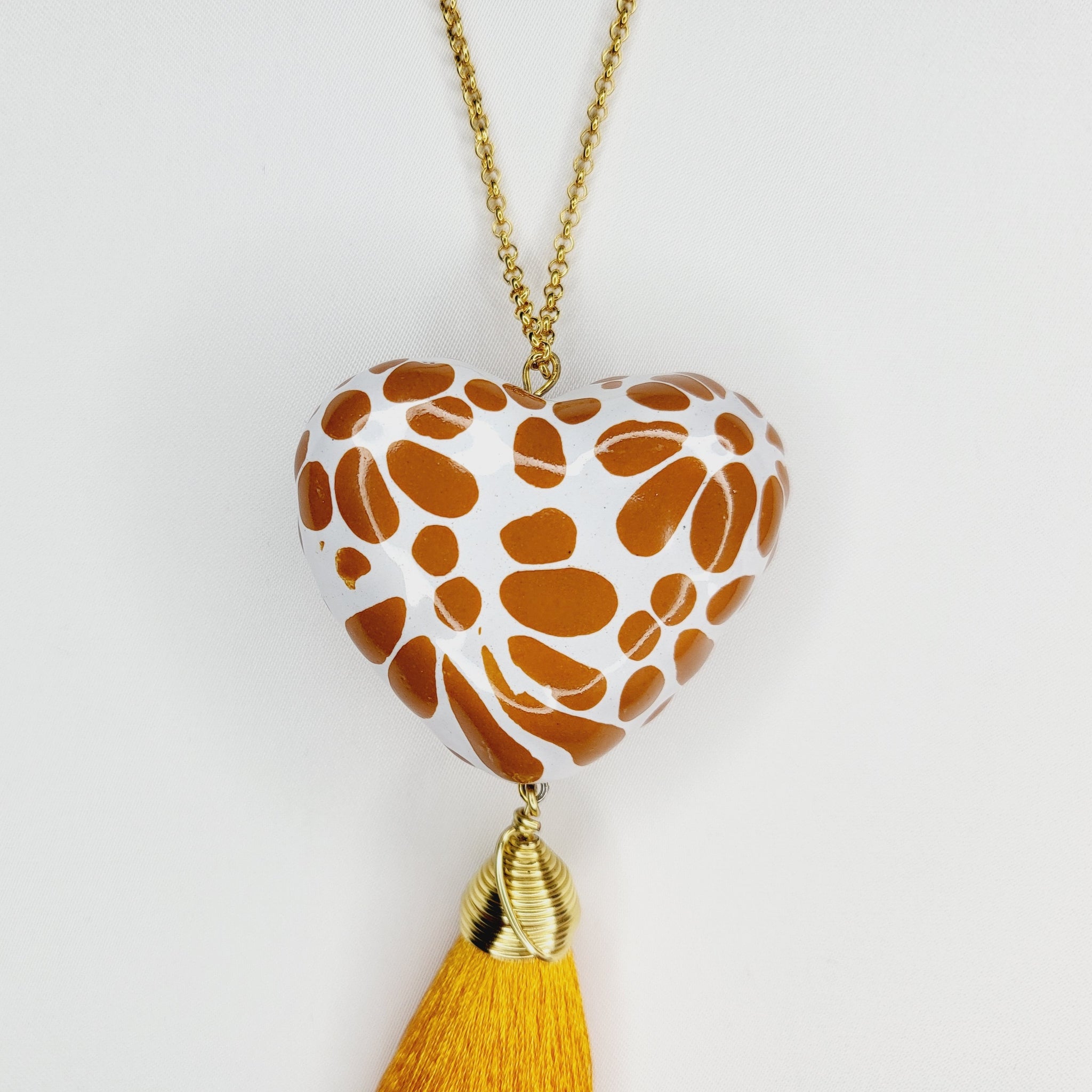 Collar largo con corazón de Talavera pintada a mano, motita de hilo y cadena y broche de chapa de oro. El diseñoy el color del corazón puede variar, ya que al ser hecho a mano, salen piezas con diseños únicos. El corazón mide aproximadamente 4 x 3.5 cm. El largo del collar es ajustable.
