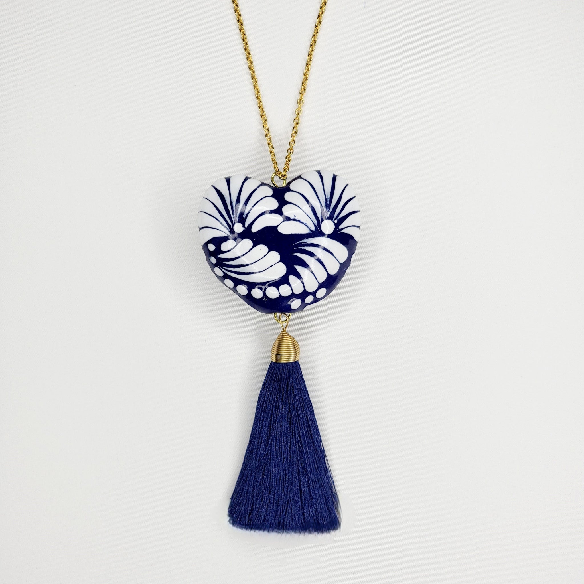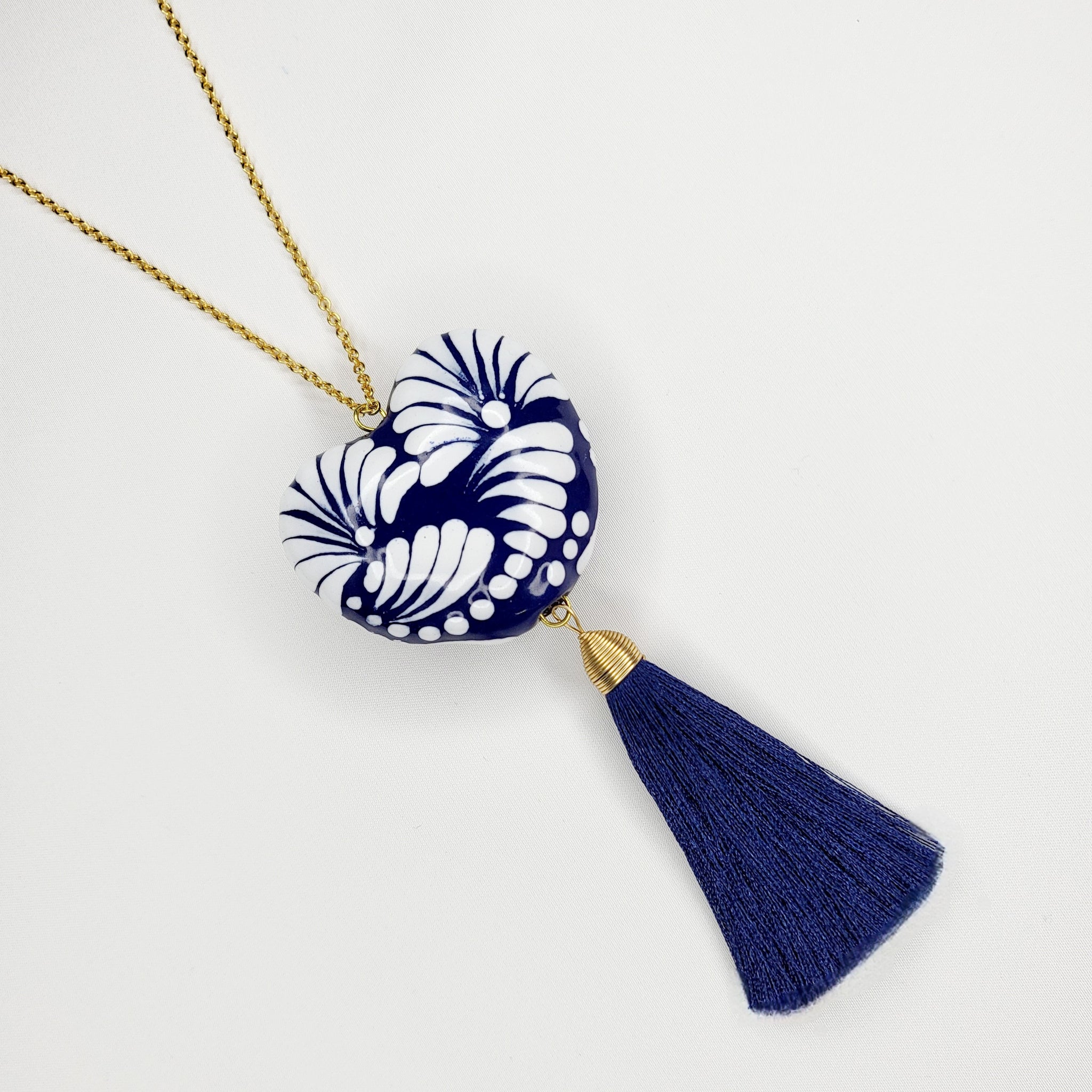 Collar largo con corazón grande de Talavera pintada a mano, motita de hilo y cadena y broche de chapa de oro. El diseño del corazón puede variar, ya que al ser hecho a mano, salen piezas con diseños únicos. El corazón mide aproximadamente 4 x 5 cm. El largo del collar es ajustable.
