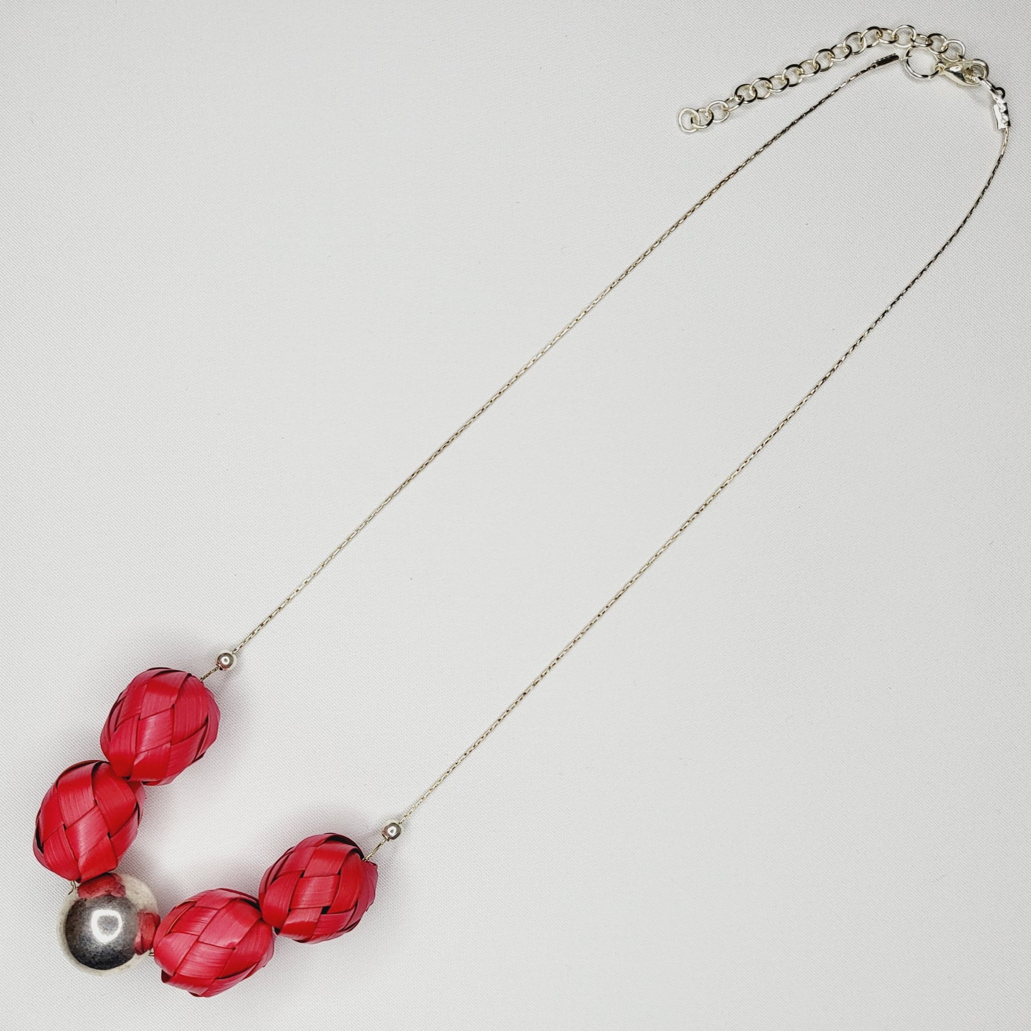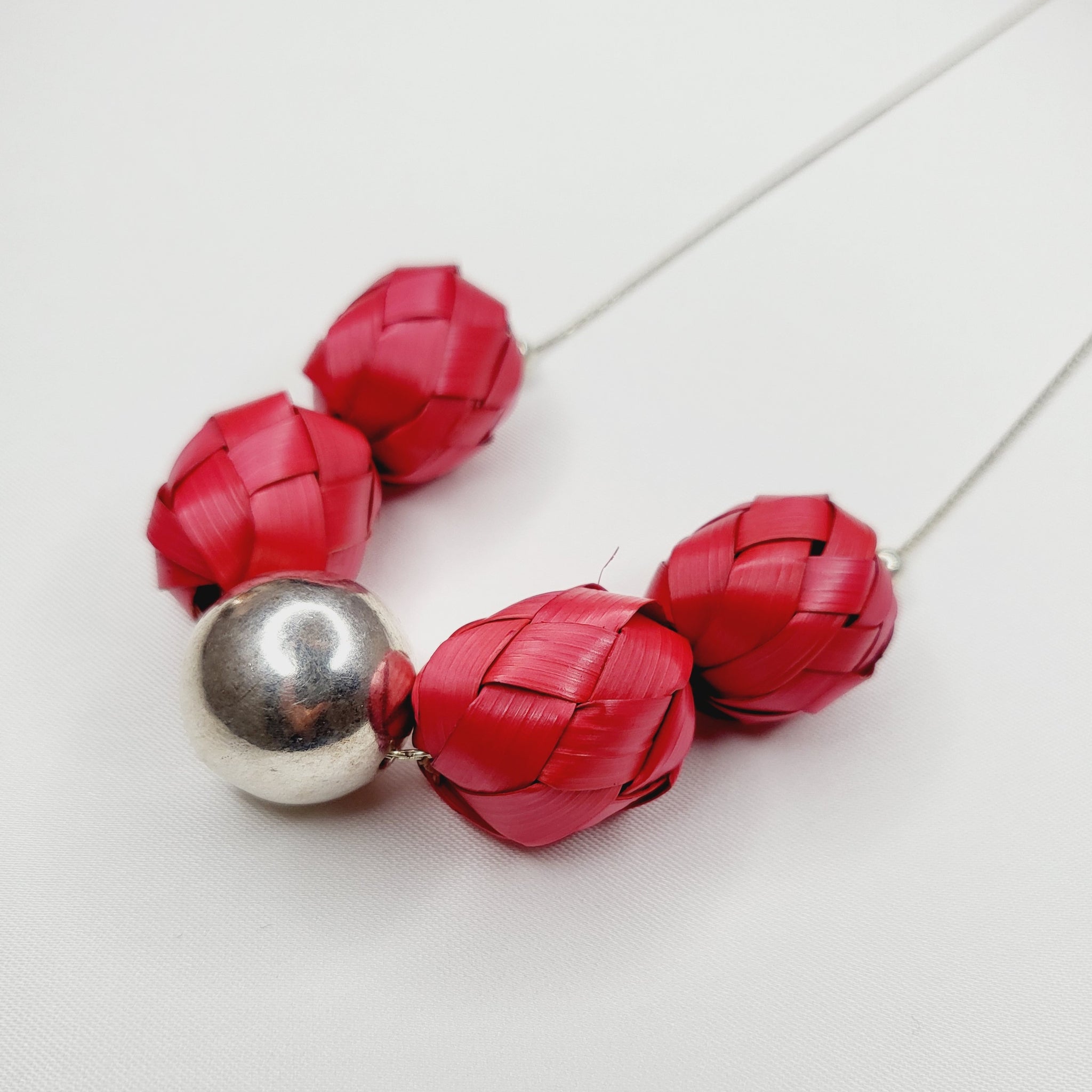 Short necklace with hand-woven colorful palm spheres with ribbon with adjustable length (29 cm - 35 cm).