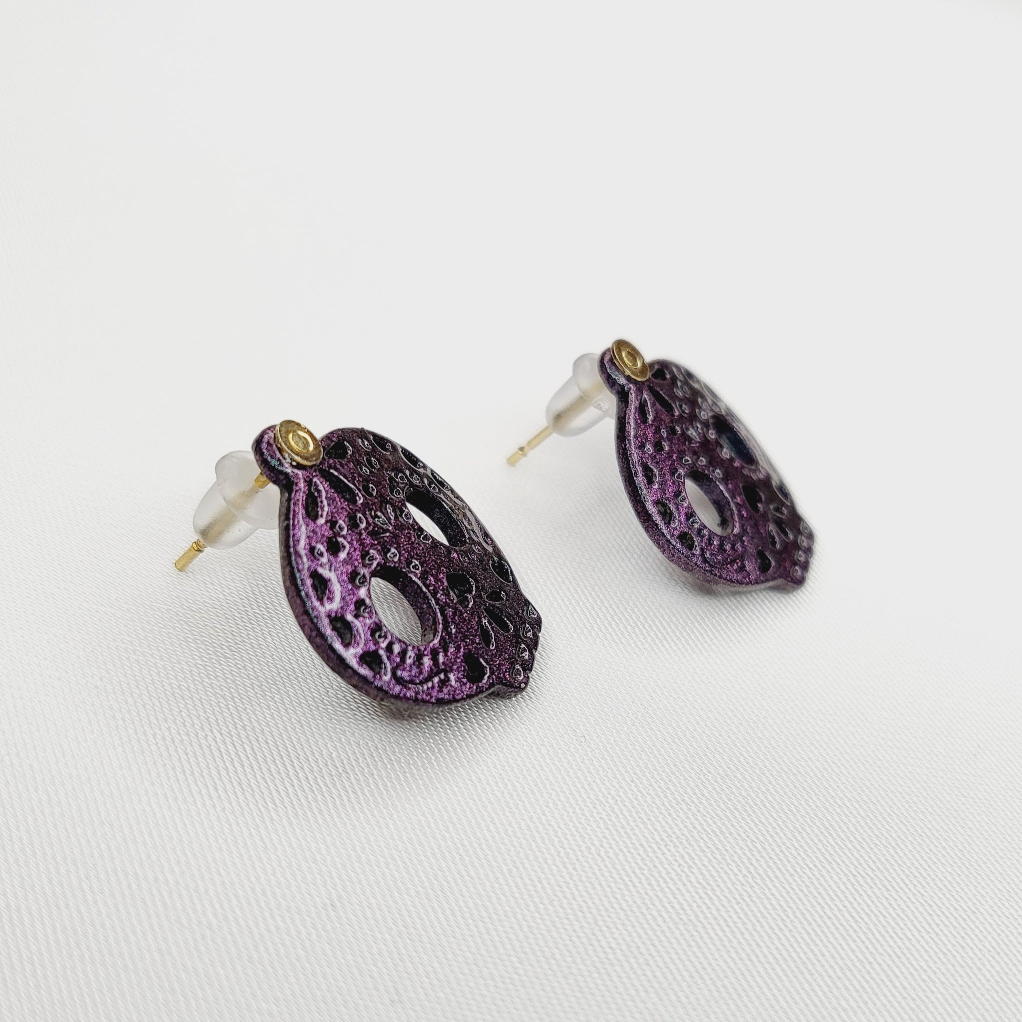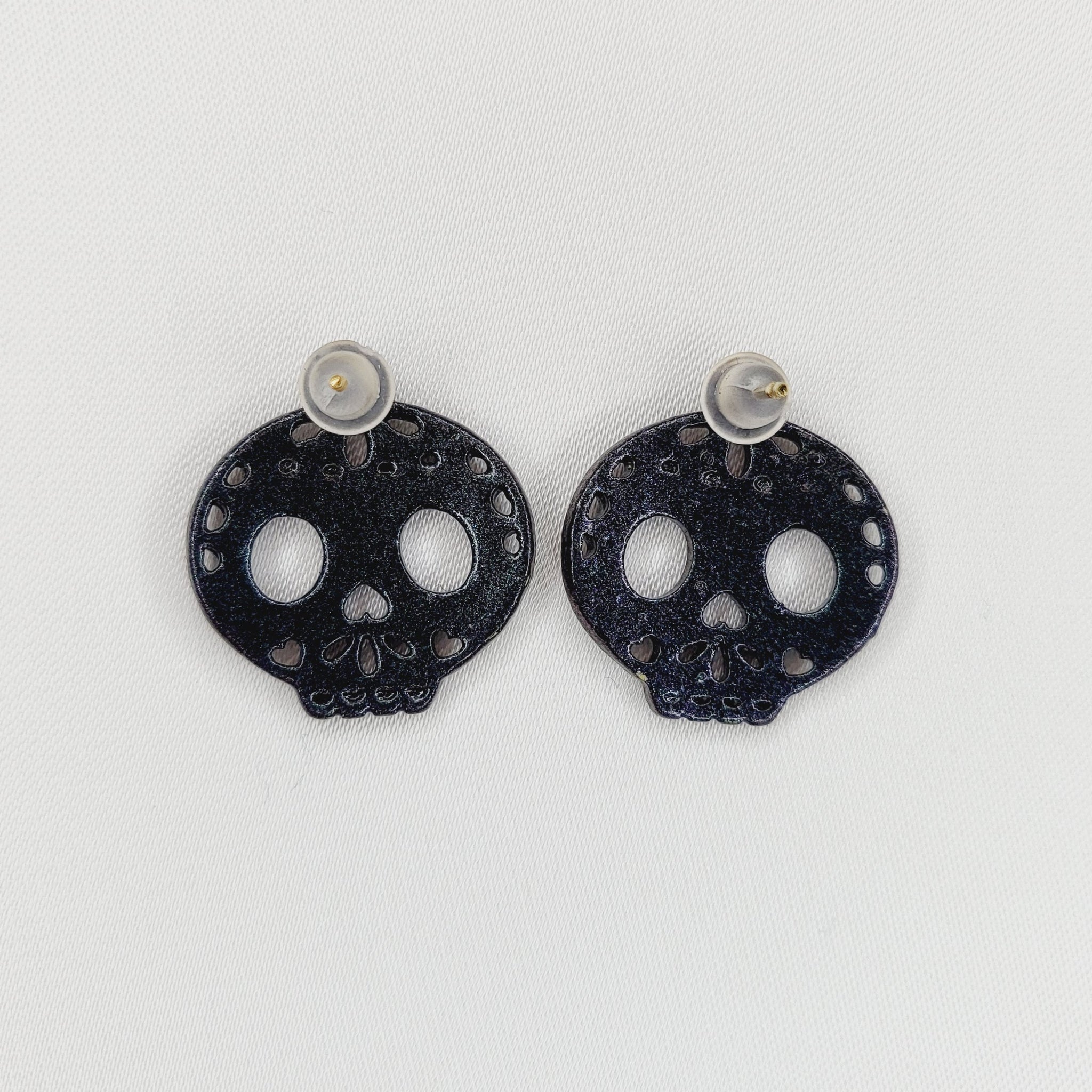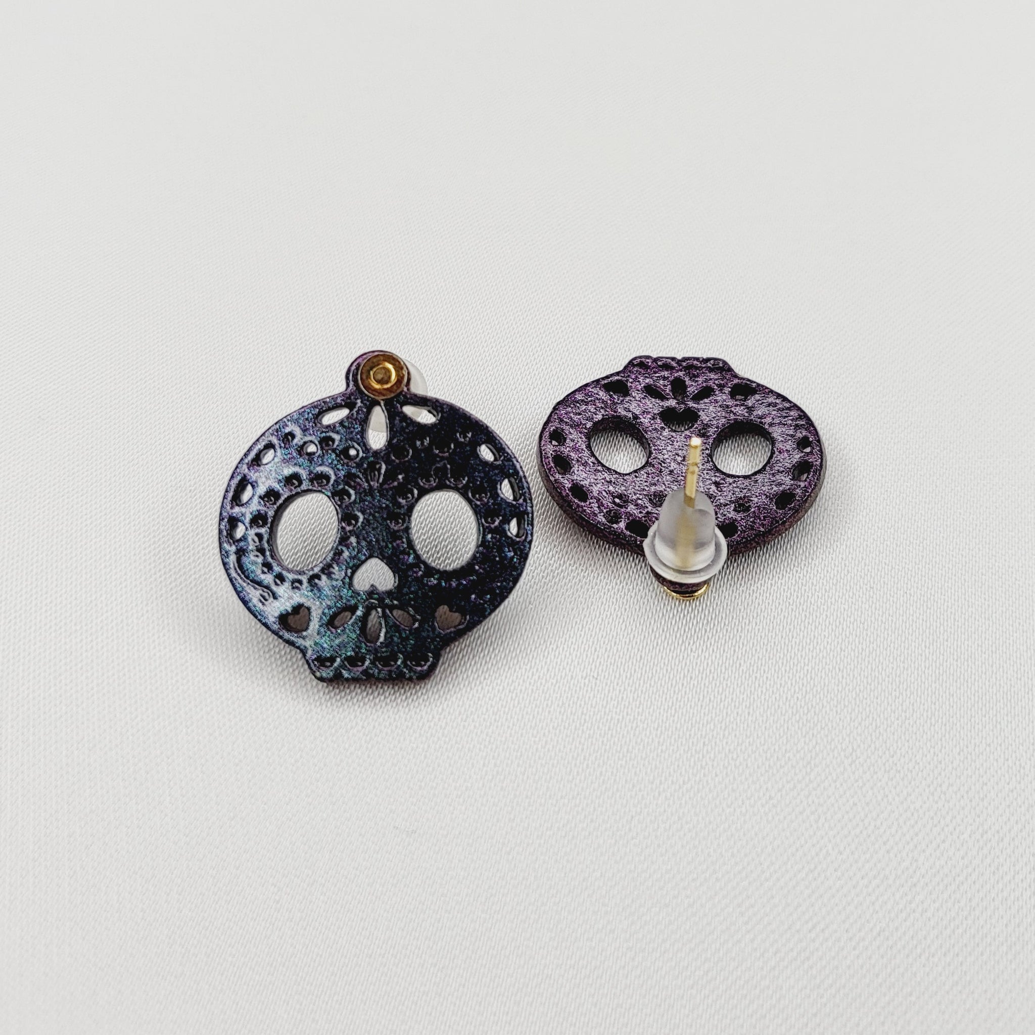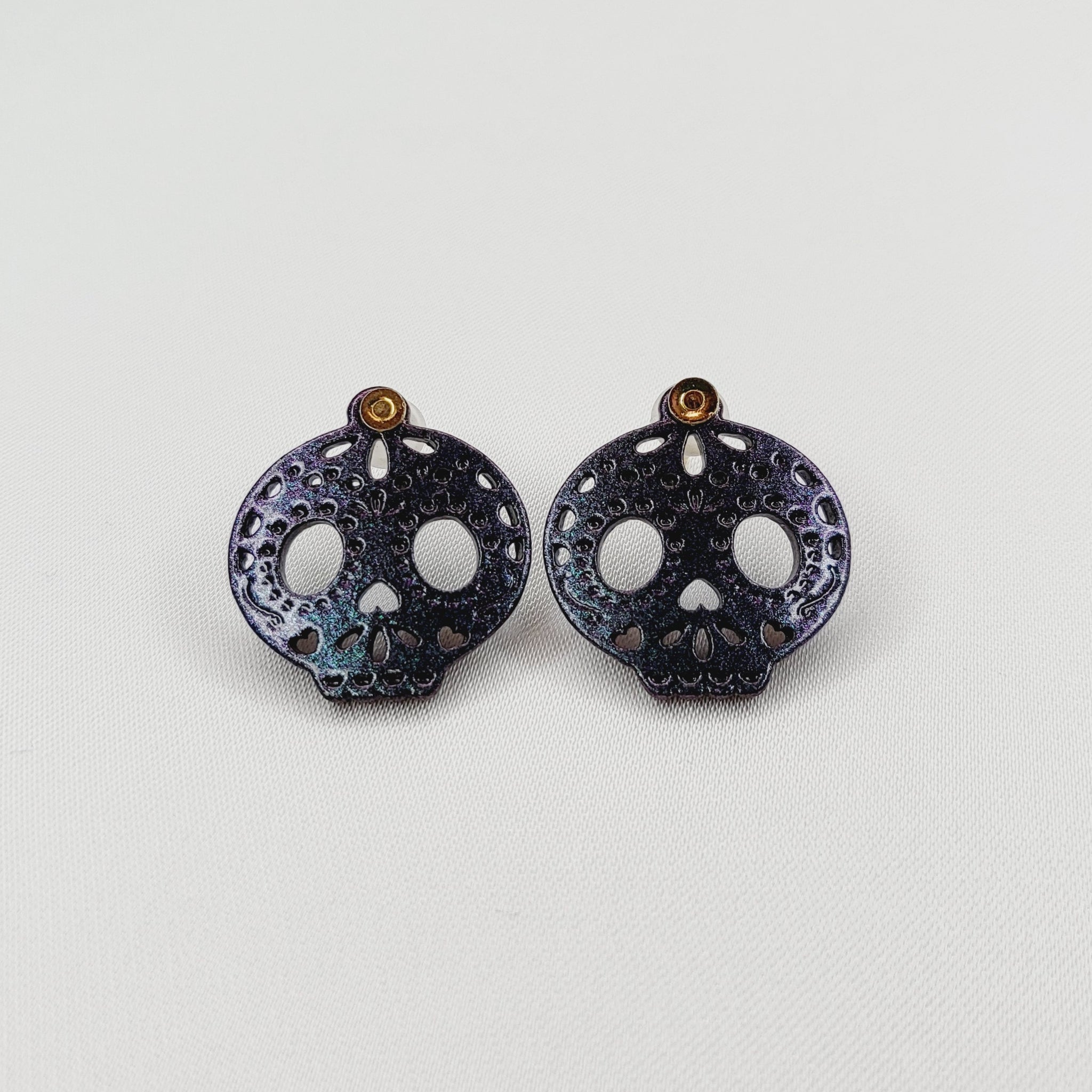 Commémorant le Jour des Morts, ces boucles d'oreilles en or s'inspirent des crânes en sucre et en chocolat, traditionnellement utilisés pour les autels. Petites boucles d'oreilles en nickel irisé (tournesol).