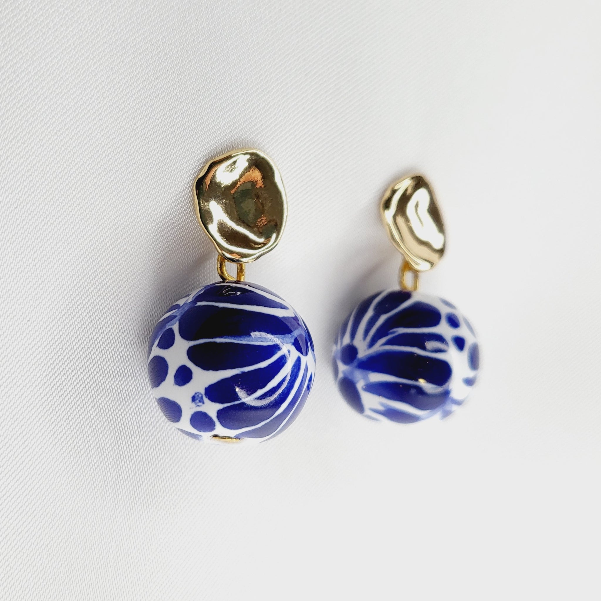 Boucles d'oreilles pendantes avec un pendentif Talavera en forme de cœur et une broche en plaqué or en forme de fleur. Longueur 3 cm.
