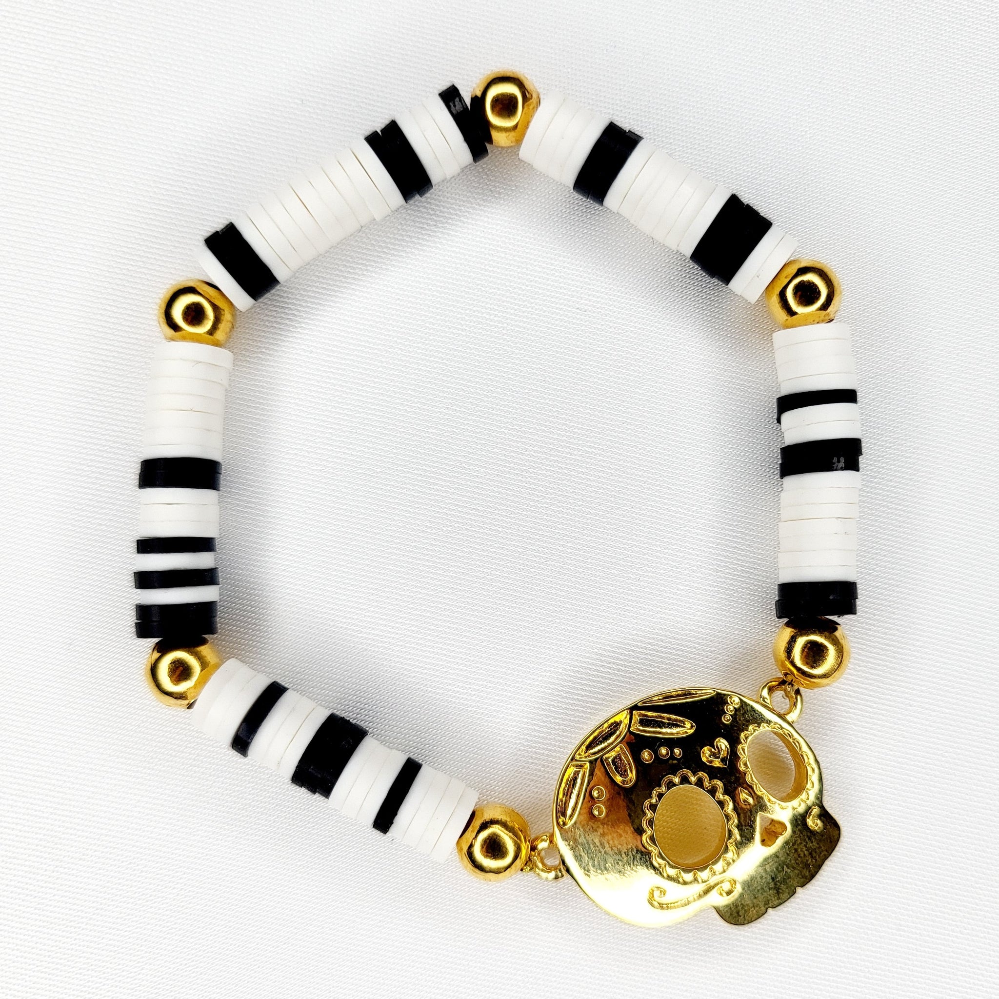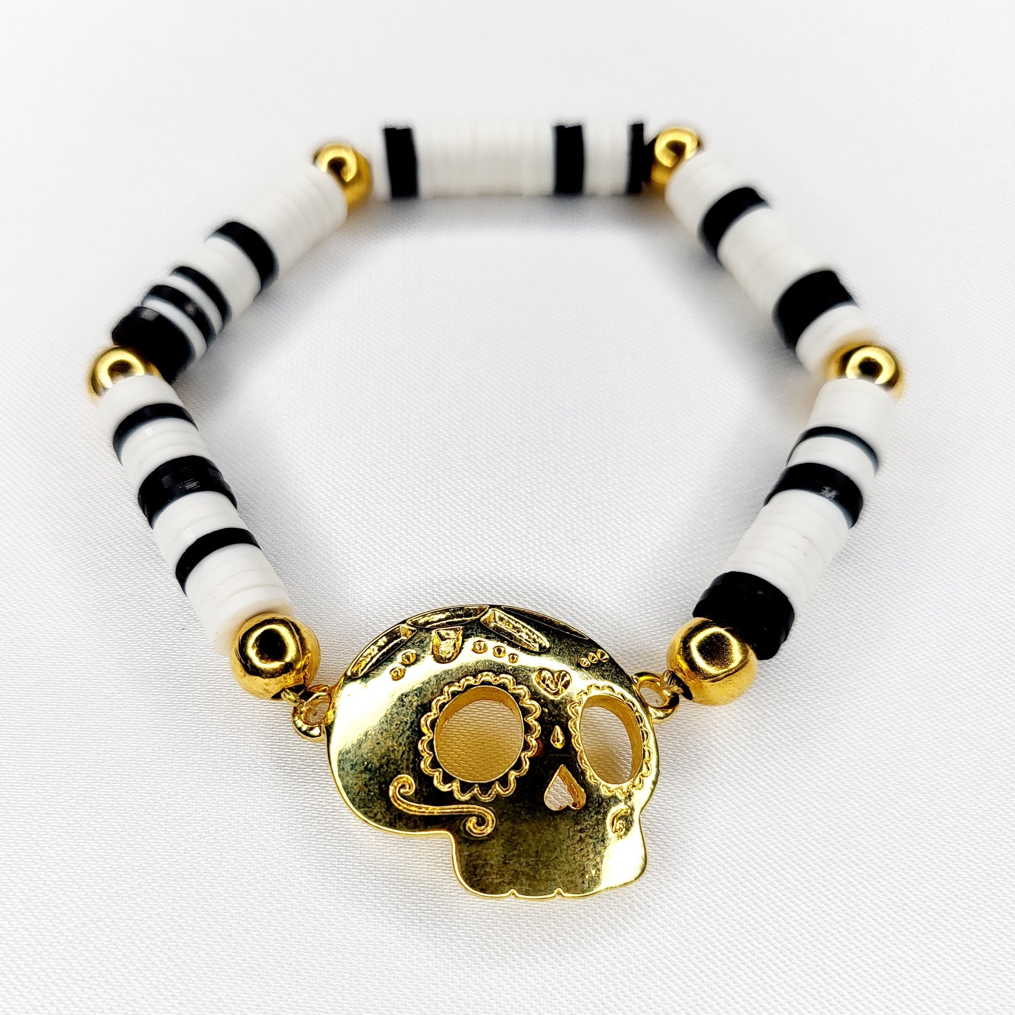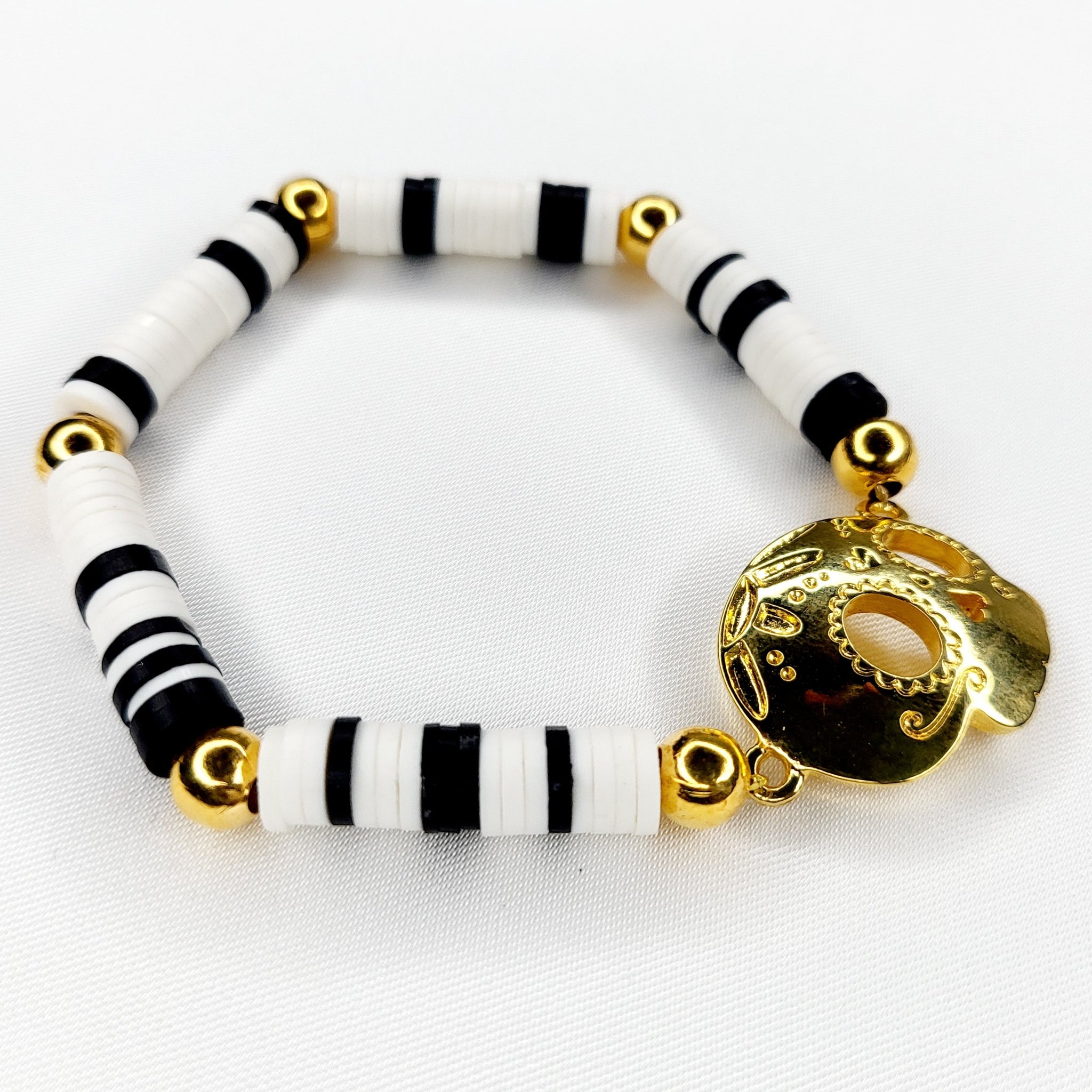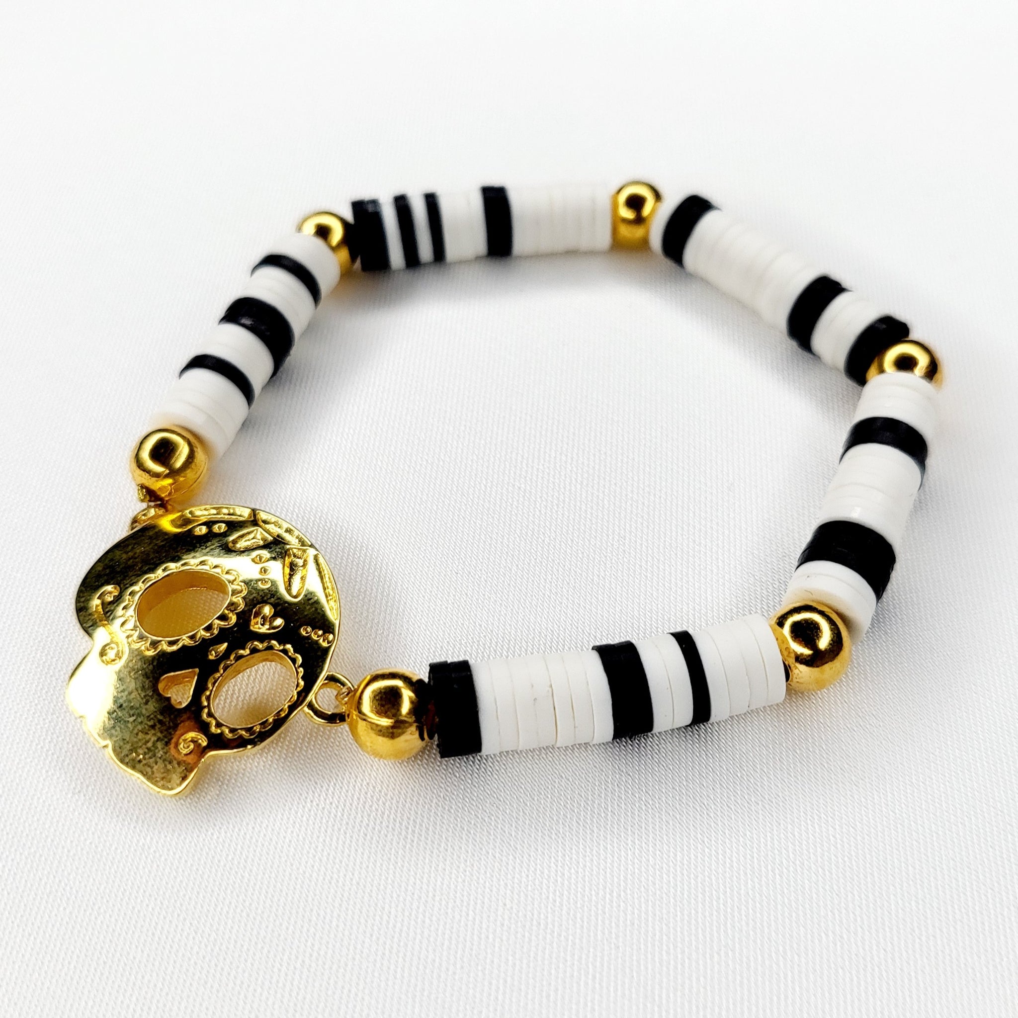 Commémorant le Jour des Morts, ce bracelet extensible avec des perles de palmier tissées à la main, des perles de verre et une breloque en plaqué or met en valeur une autre icône qui représente cette fête, le crâne en chocolat.