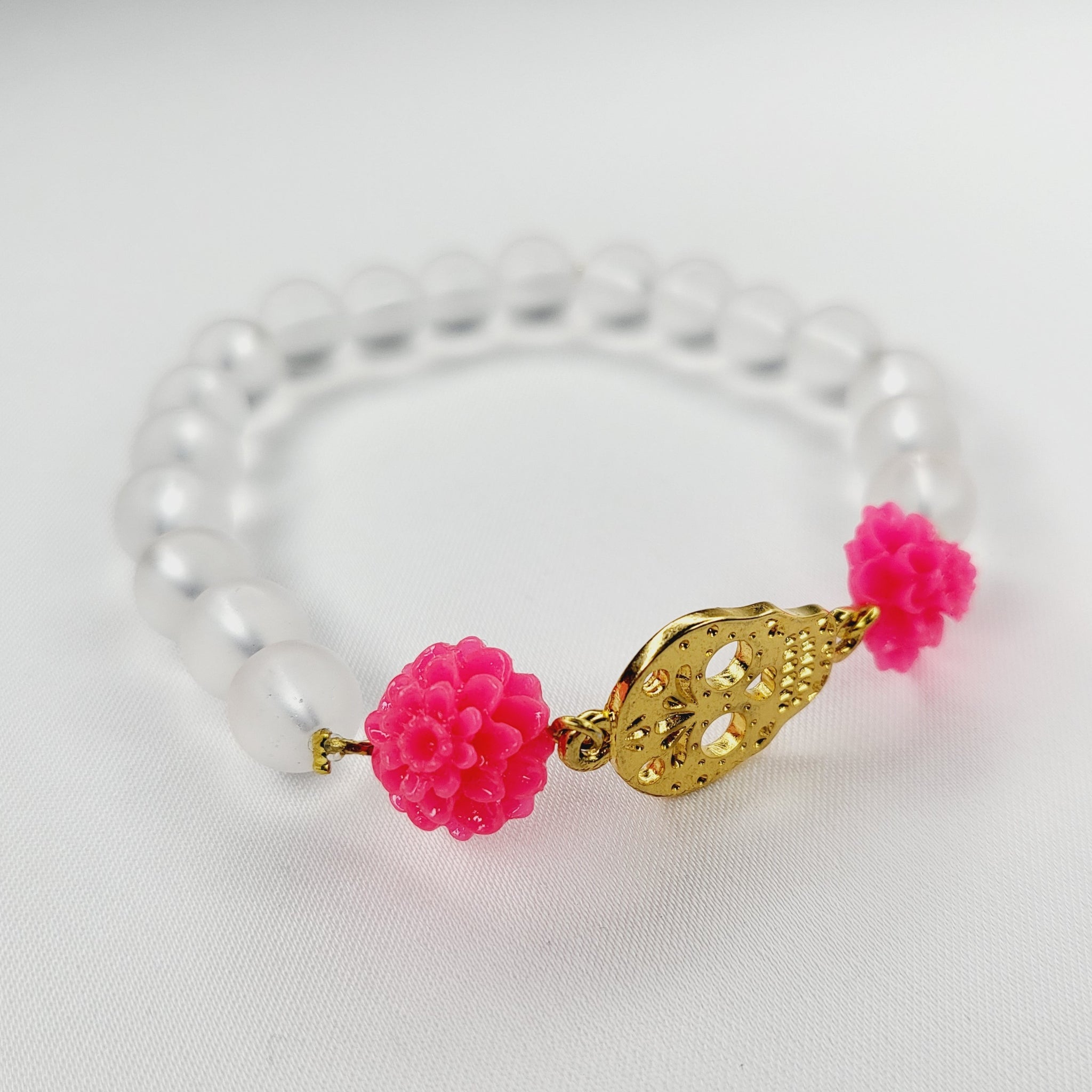 Bracelet élastique avec perles transparentes imitant du sucre, fleurs en résine et breloque en plaqué or.