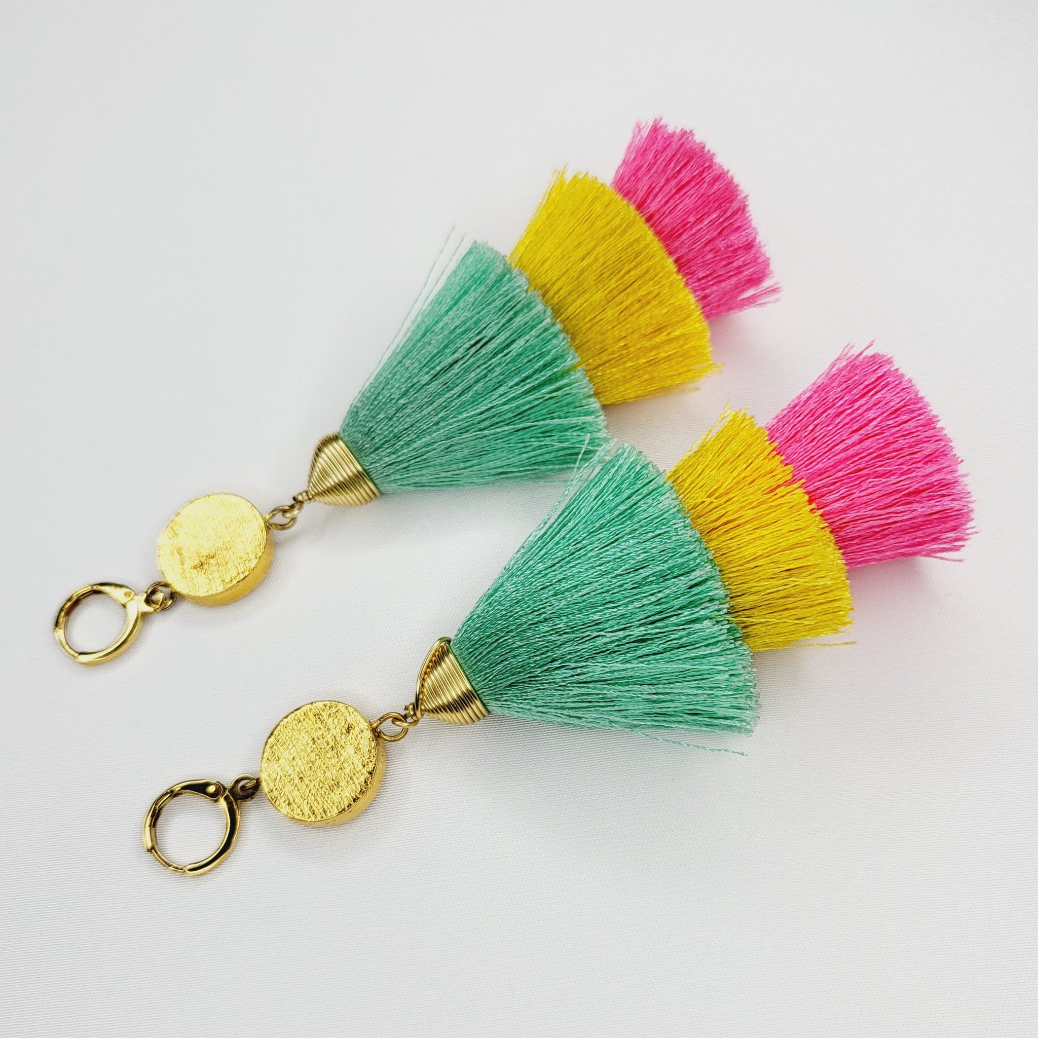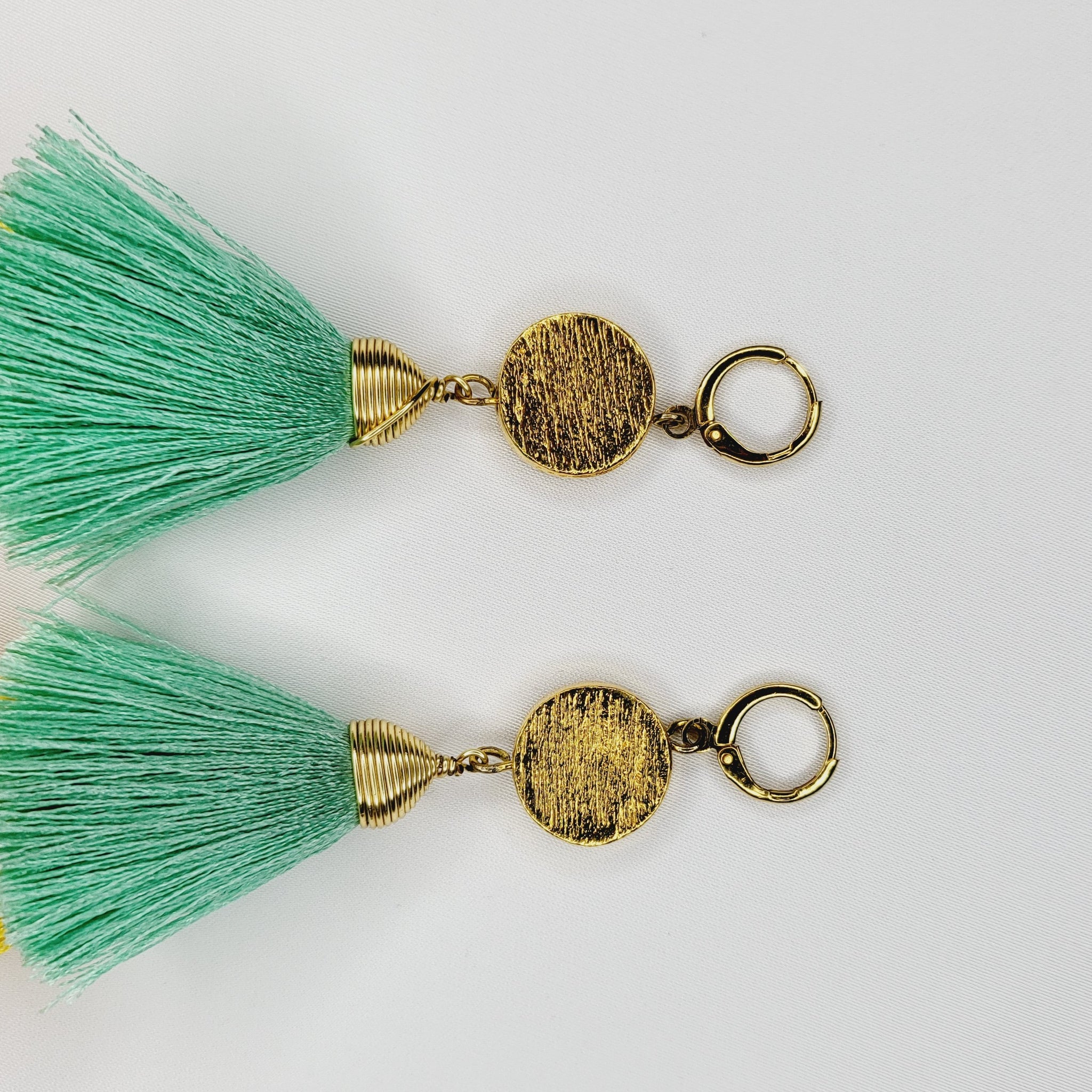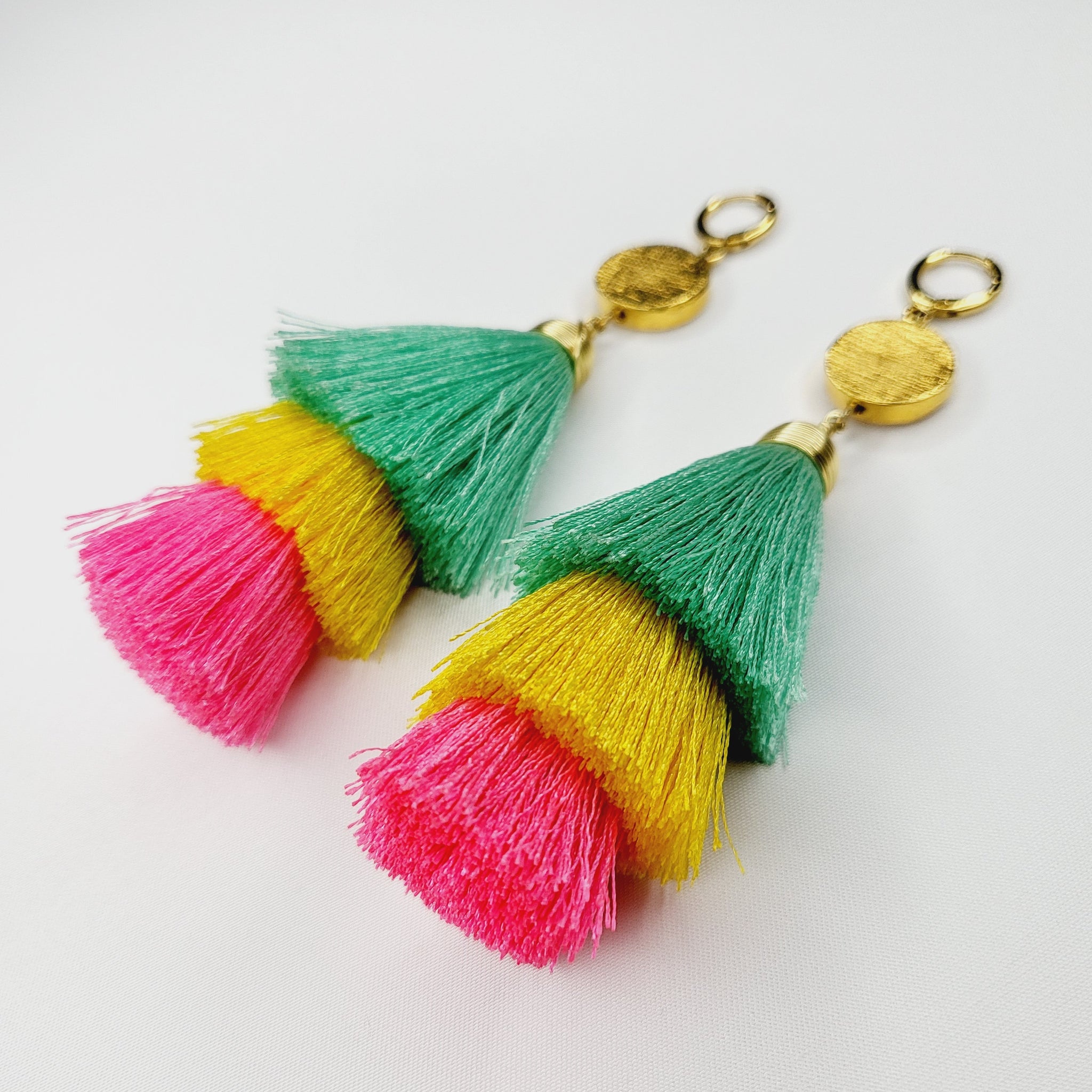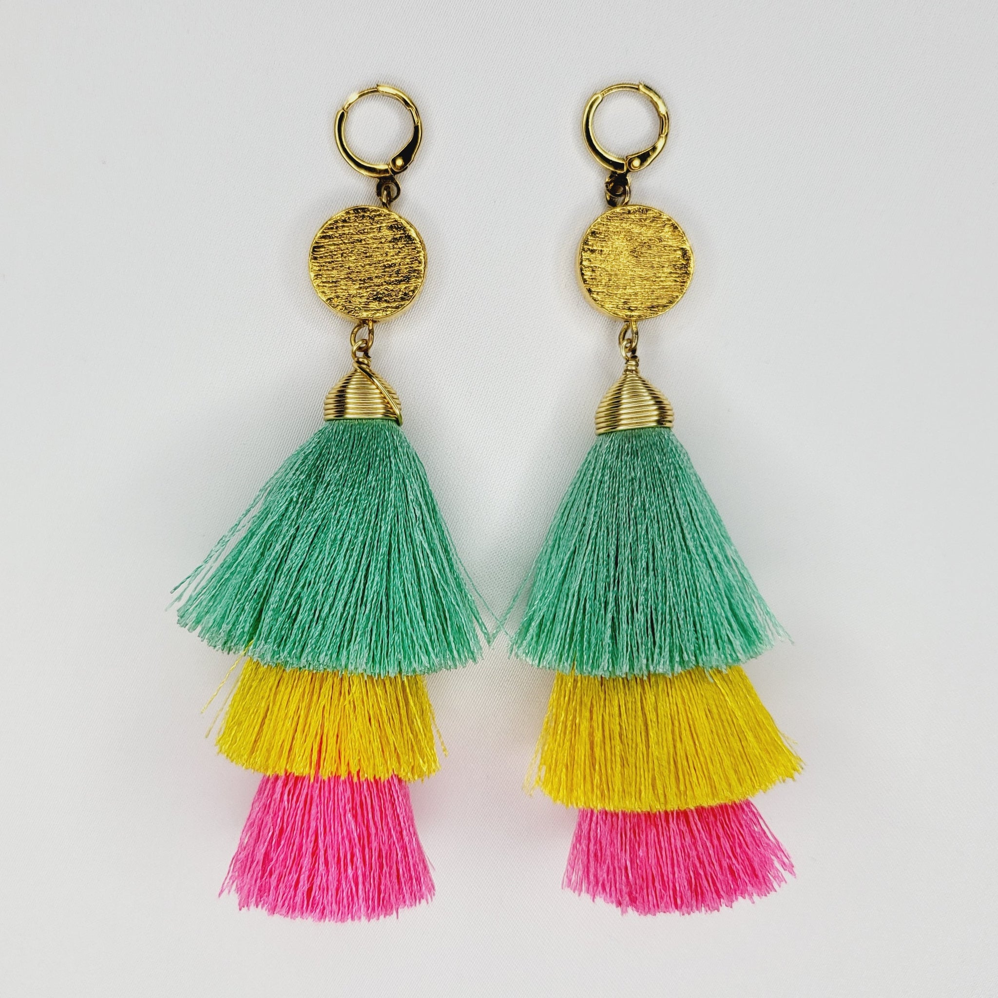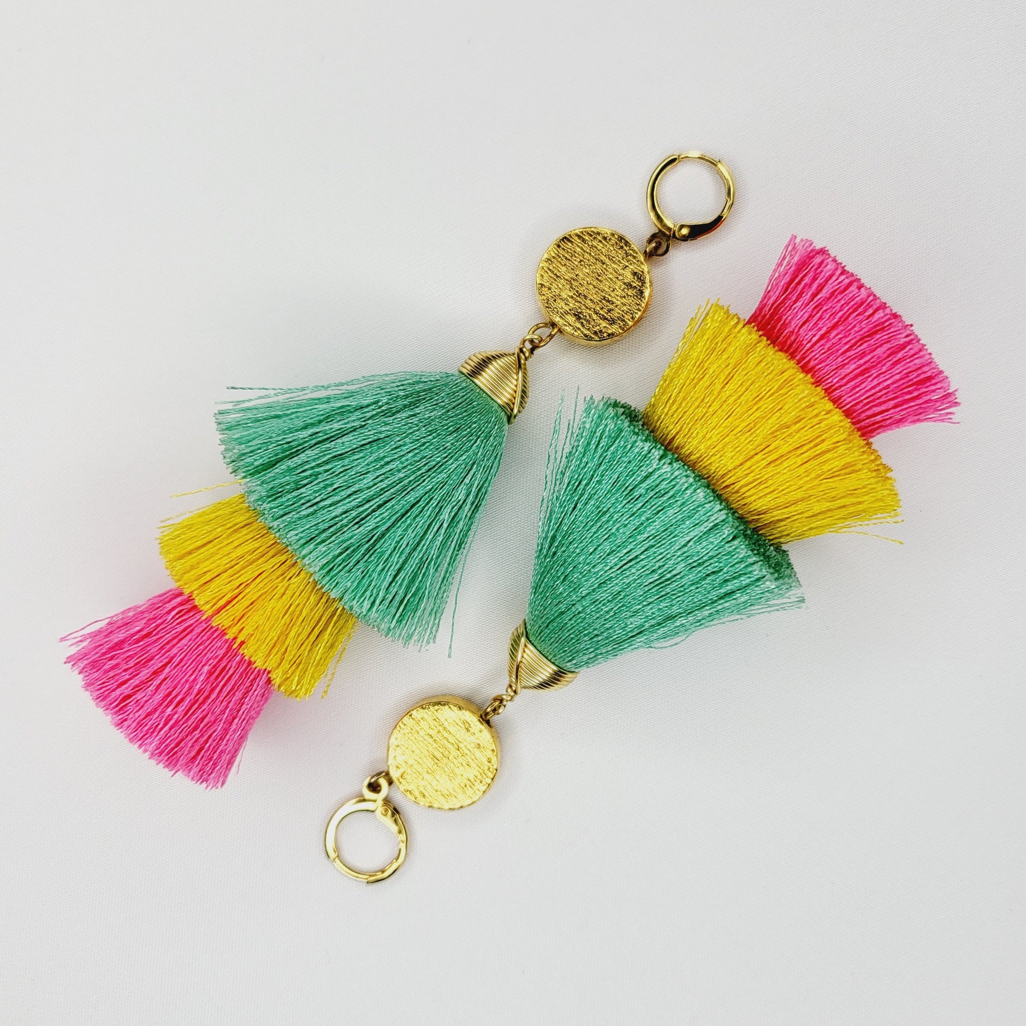 Arete colgante con motitas de hilo de 3 colores, dije y broche de chapa de oro. Largo 10 cms y ancho 3 cms.