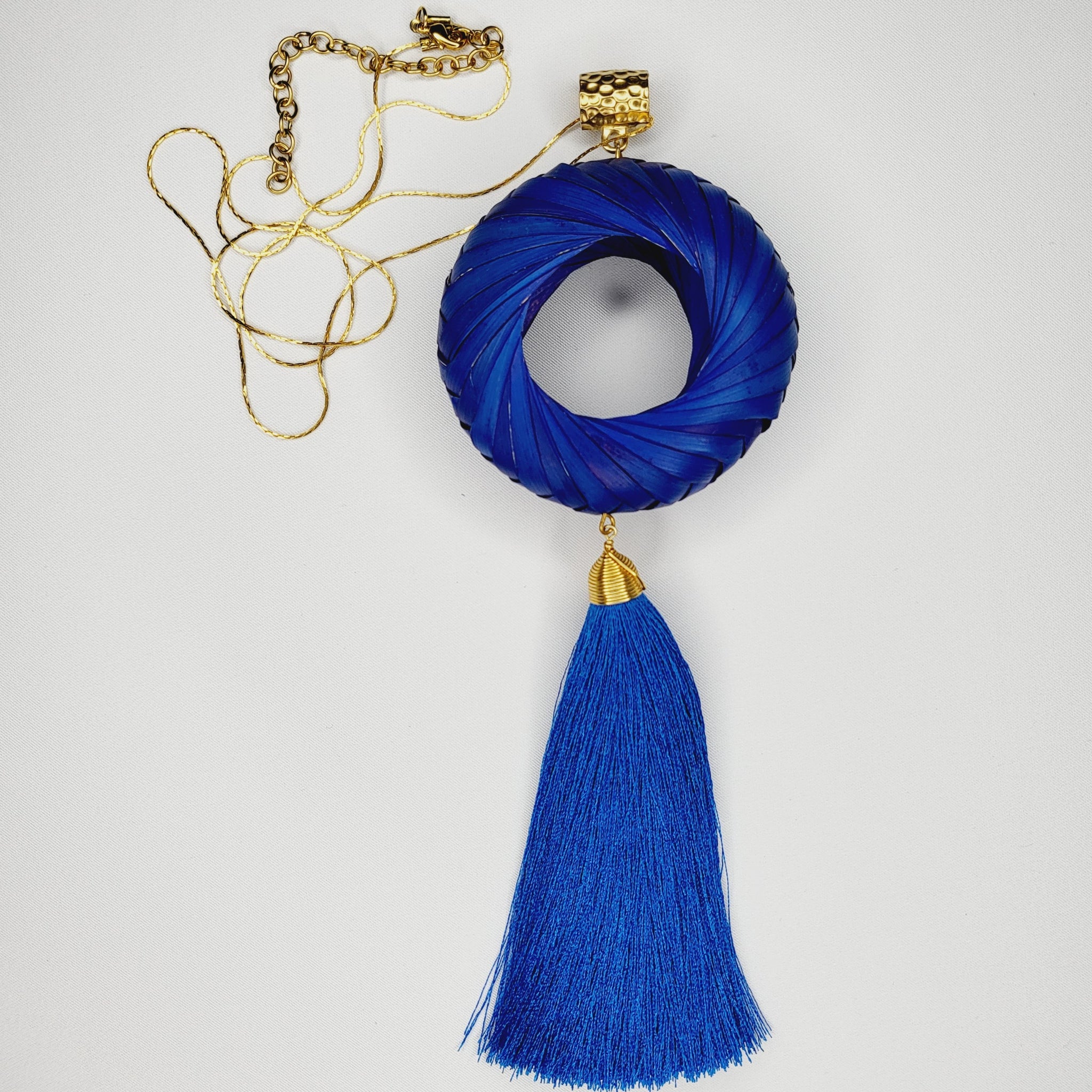 Collar largo con cadena y broche de chapa de oro, aro de palma teñido tejido a mano, y motita larga de hilo. Largo ajustable.
