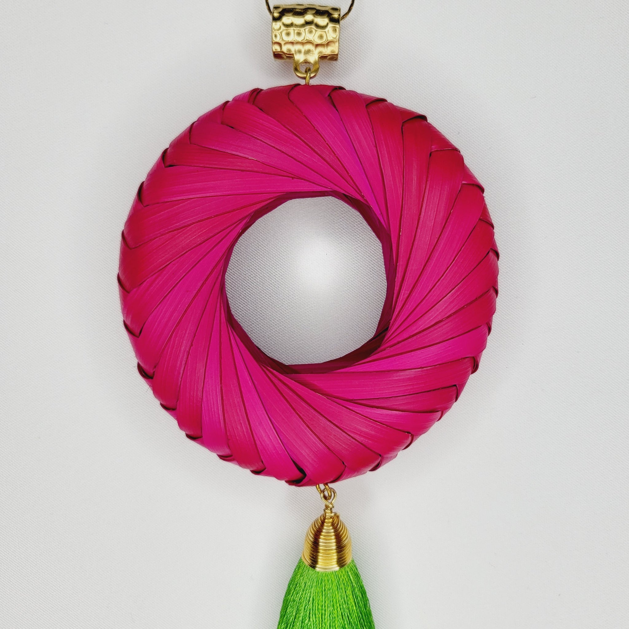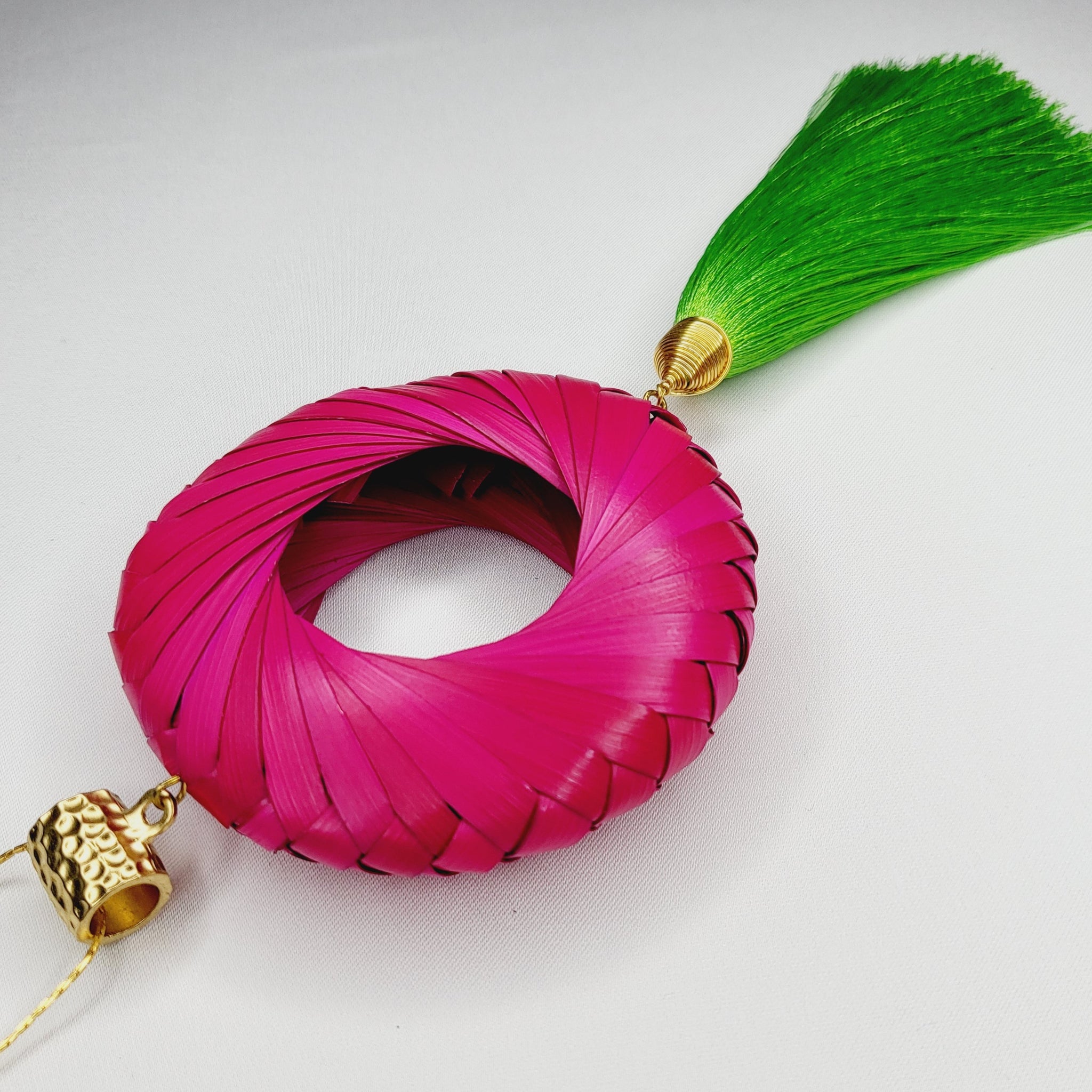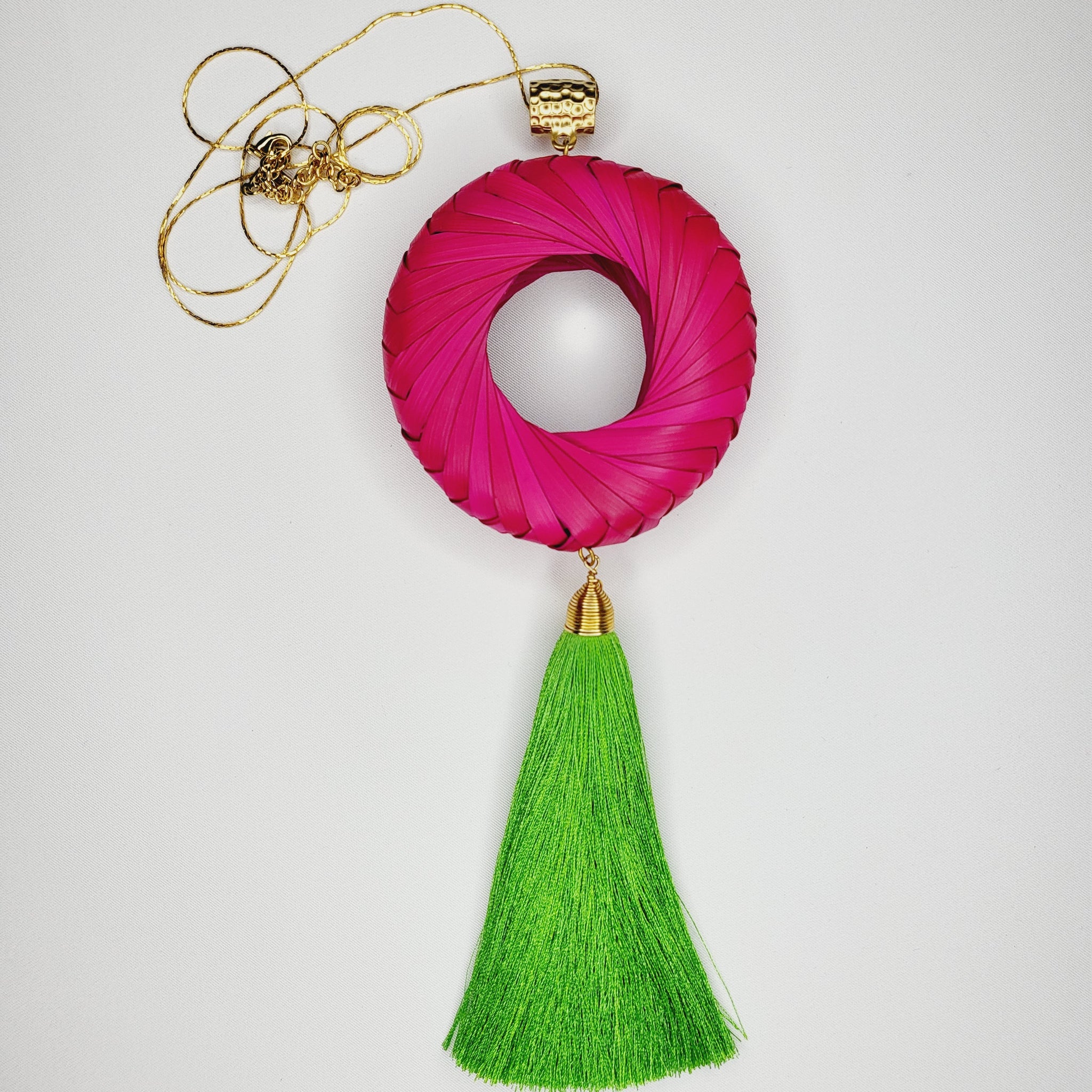 Collar largo con cadena y broche de chapa de oro, aro de palma teñido tejido a mano, y motita larga de hilo. Largo ajustable.
