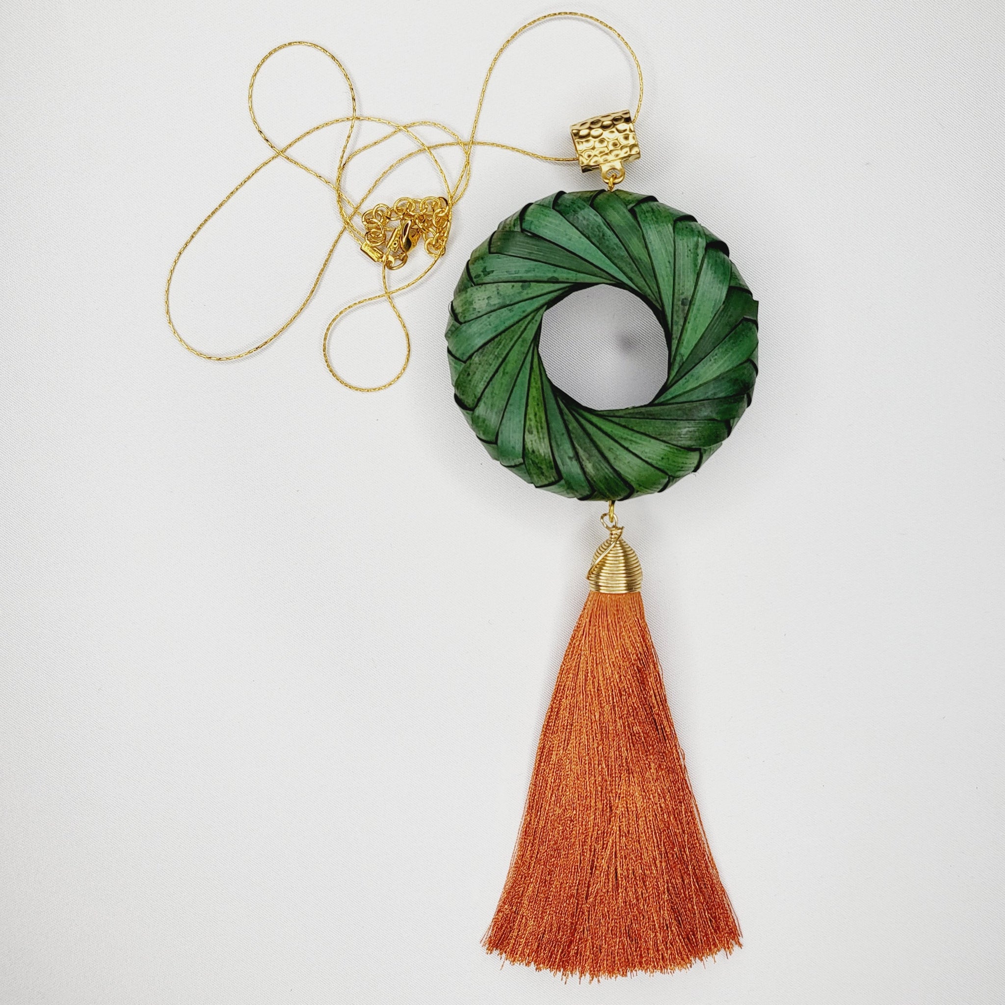 Collar largo con cadena y broche de chapa de oro, aro de palma teñido tejido a mano, y motita larga de hilo. Largo ajustable.