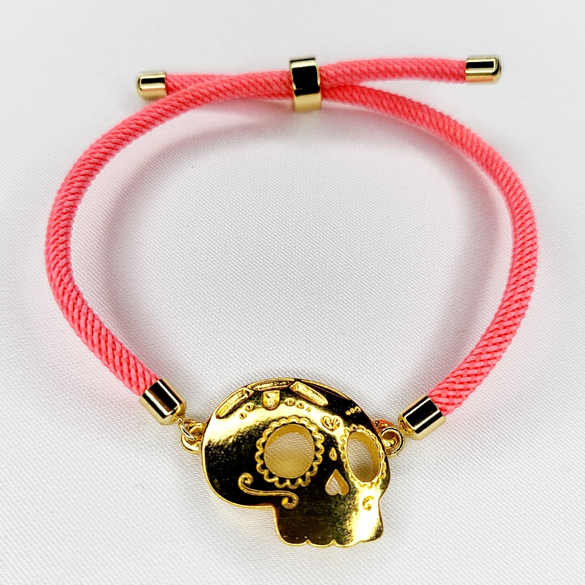 Pulsera de poliéster ajustable con dije grande de chapa de oro en forma de Calvera.