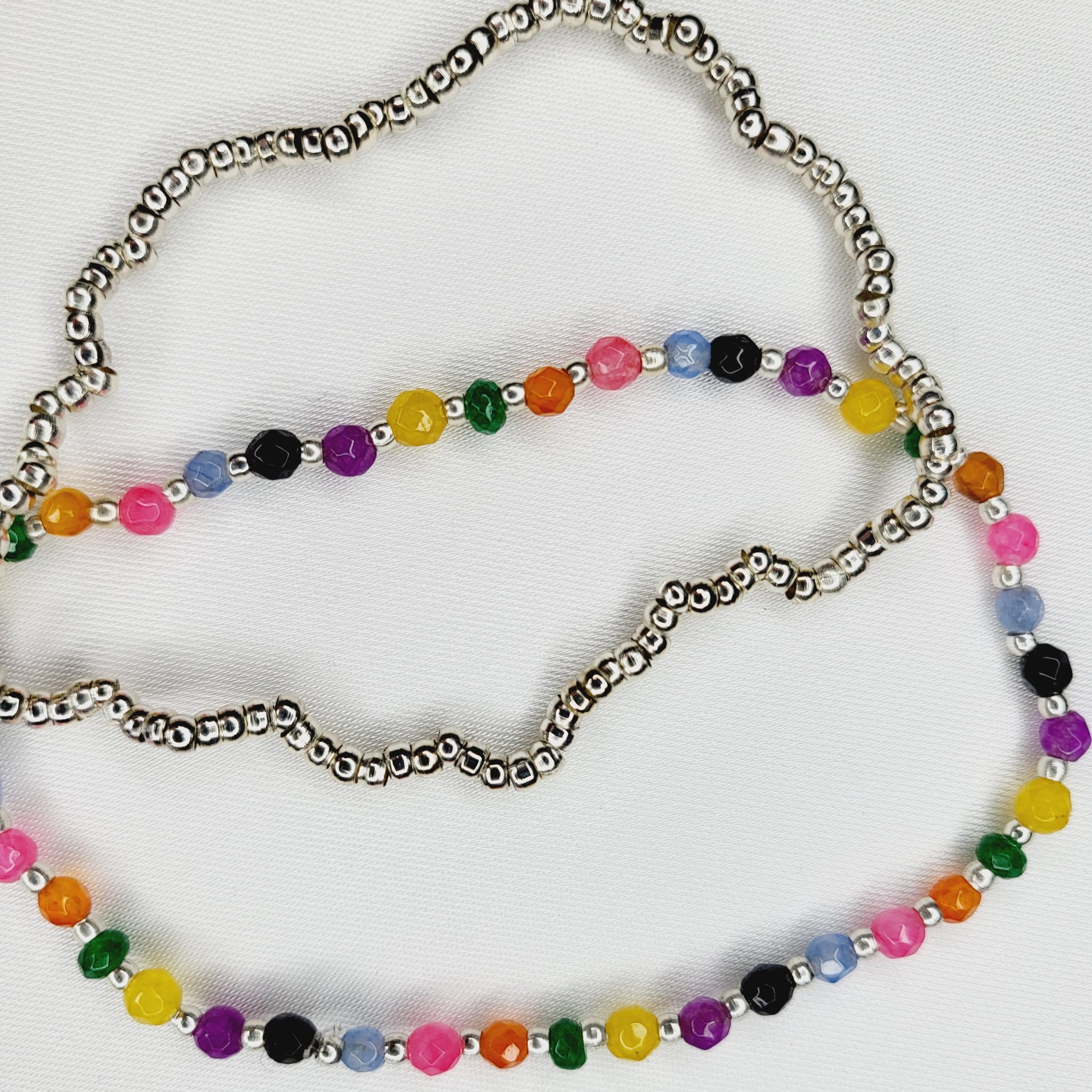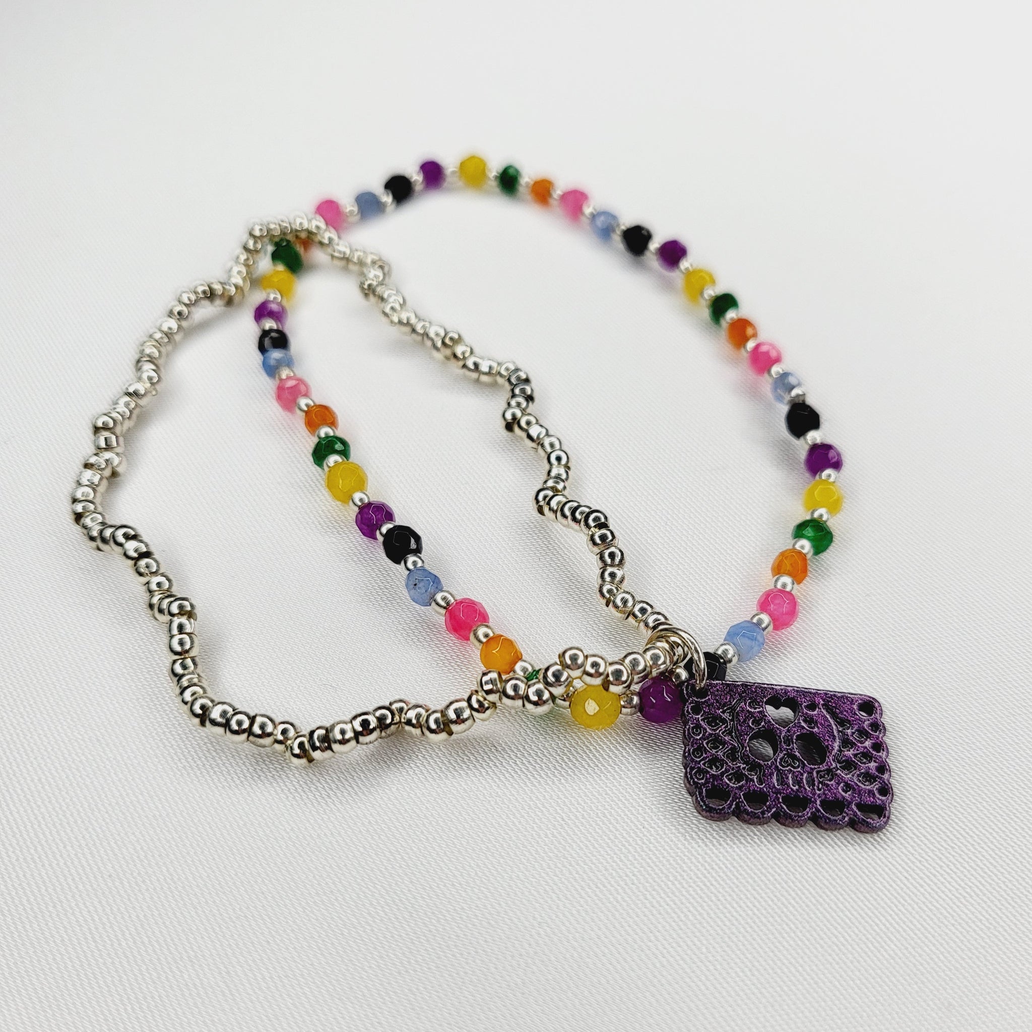 Una pulsera de cuentas miniaturas de ágatas y otra de cuentas de chapa de oro, unidas por un dije en niquel iridiscente en forma de papel picado.